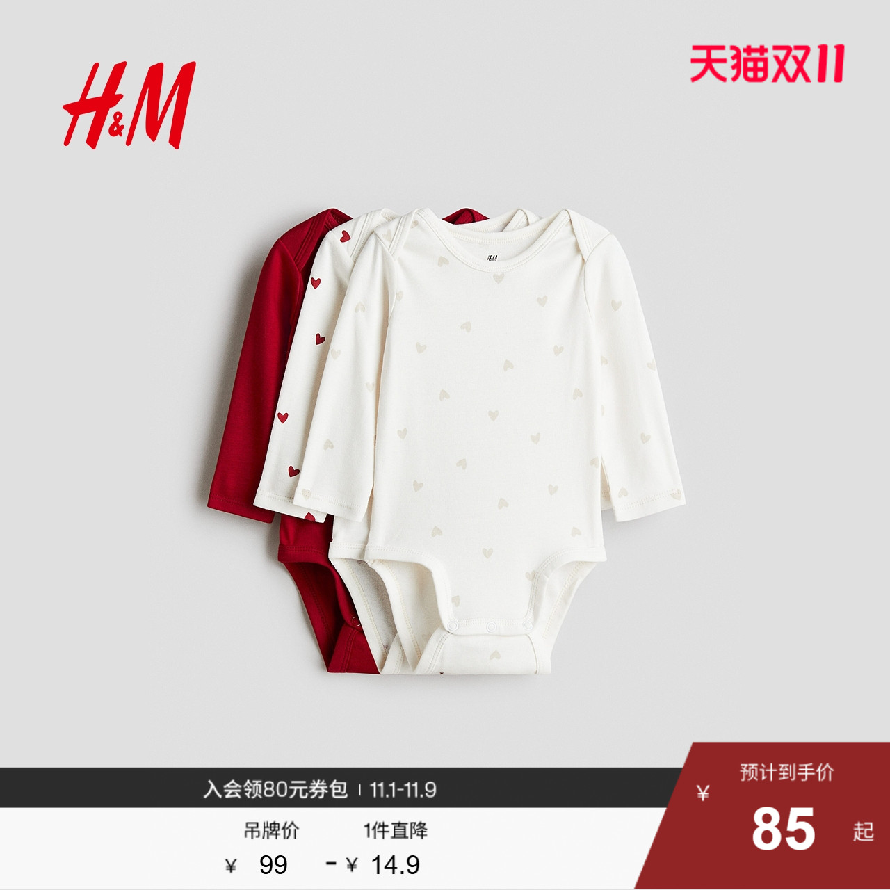HM童装女婴连身衣3件装2025秋季新款印花信封领哈衣1265824