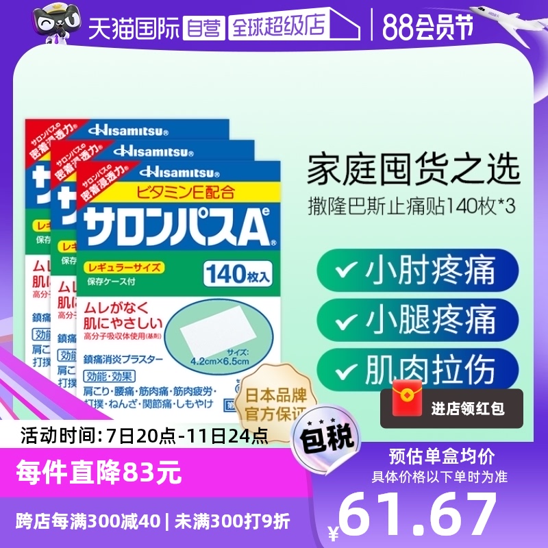 淘宝天猫【自营】日本久光撒隆巴斯镇痛膏药腰肩止痛膏贴腰酸痛贴140片*3优惠券折扣价格–彩云间