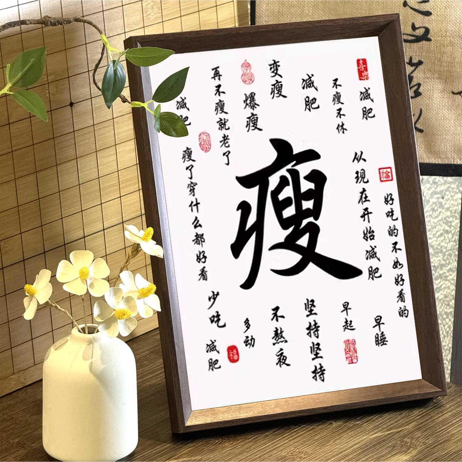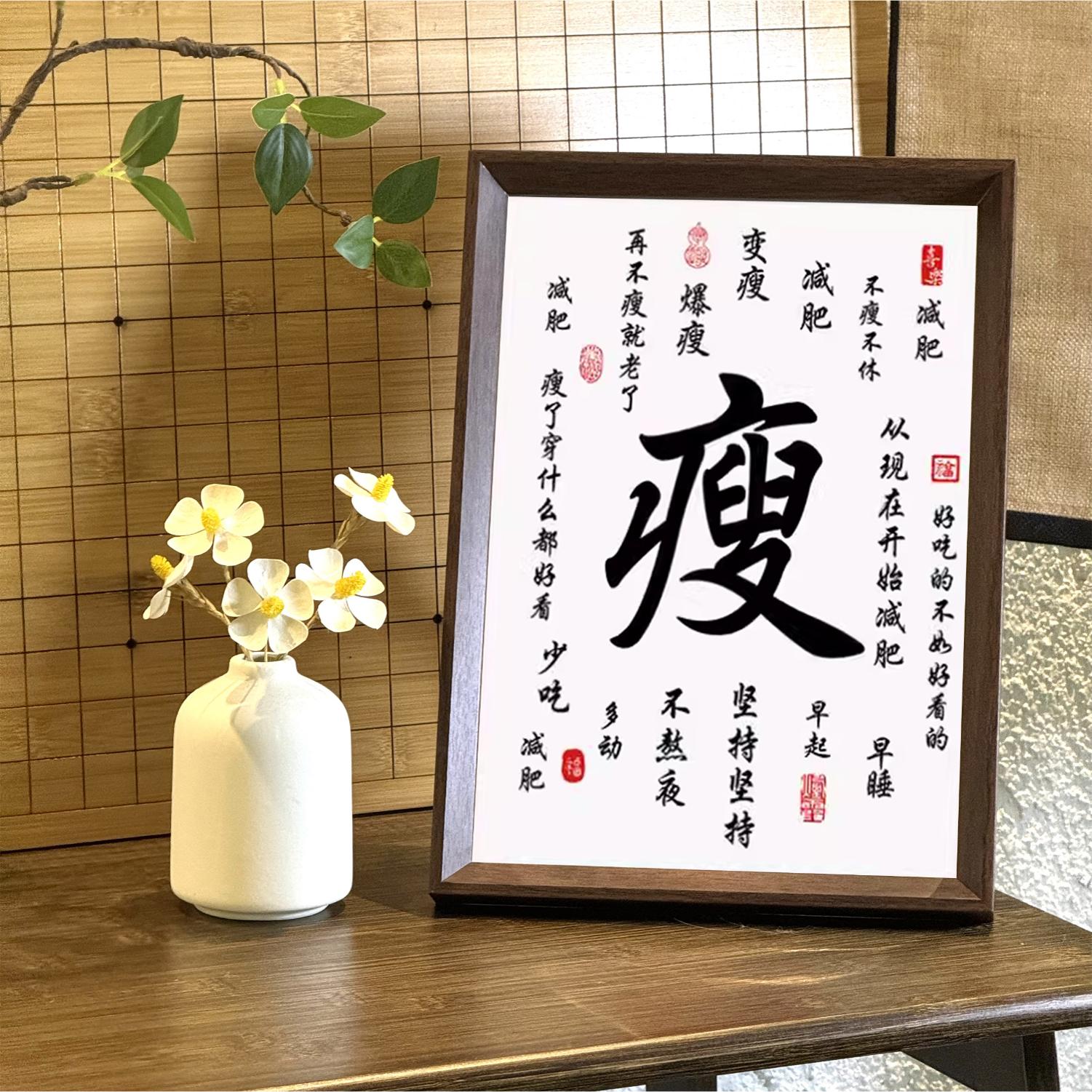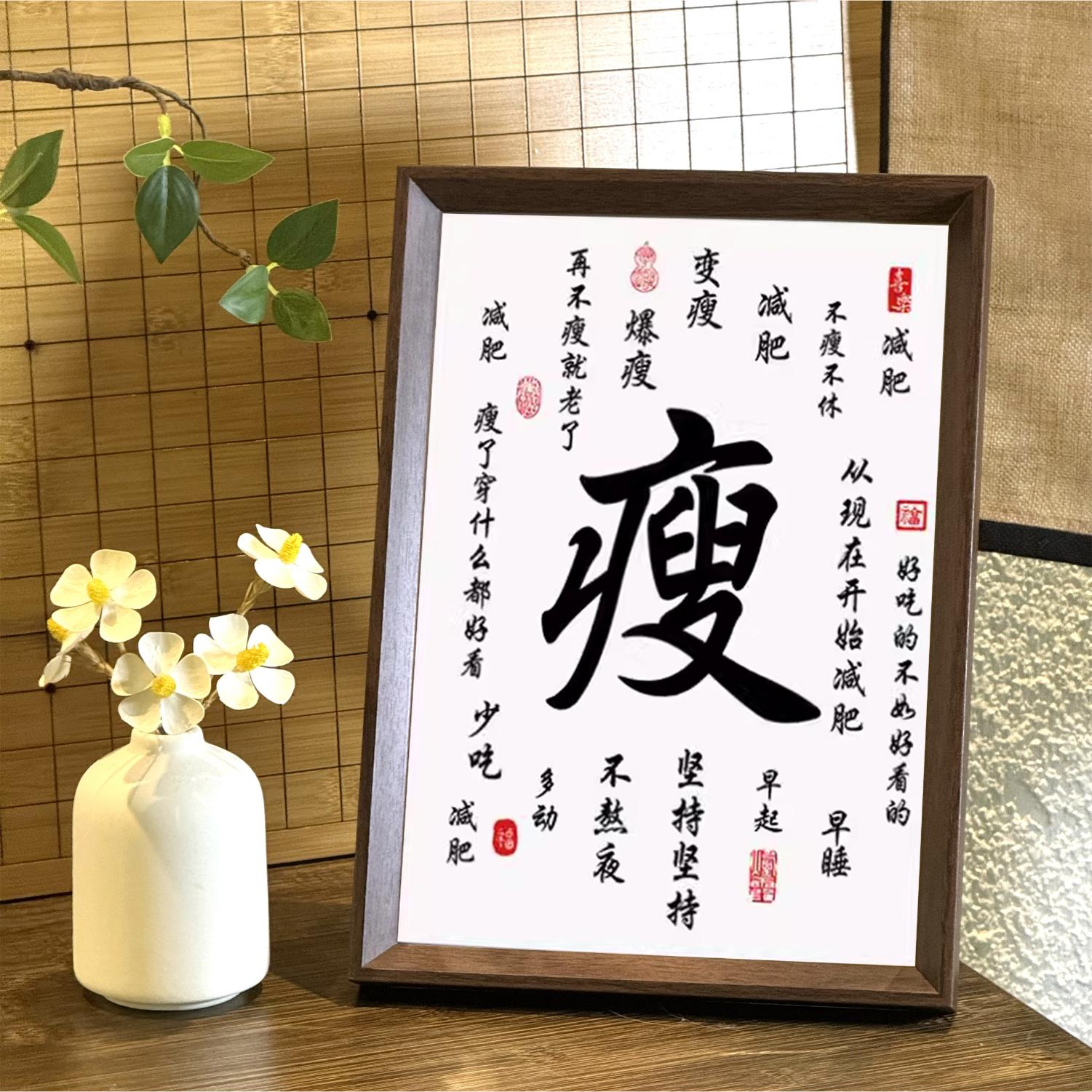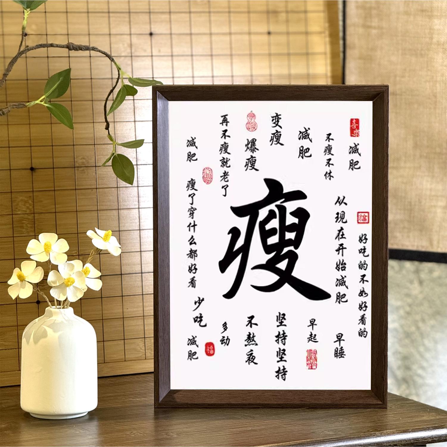 爆瘦创意字画减肥励志书法实木新中式相框桌面摆件装饰画摆台挂画