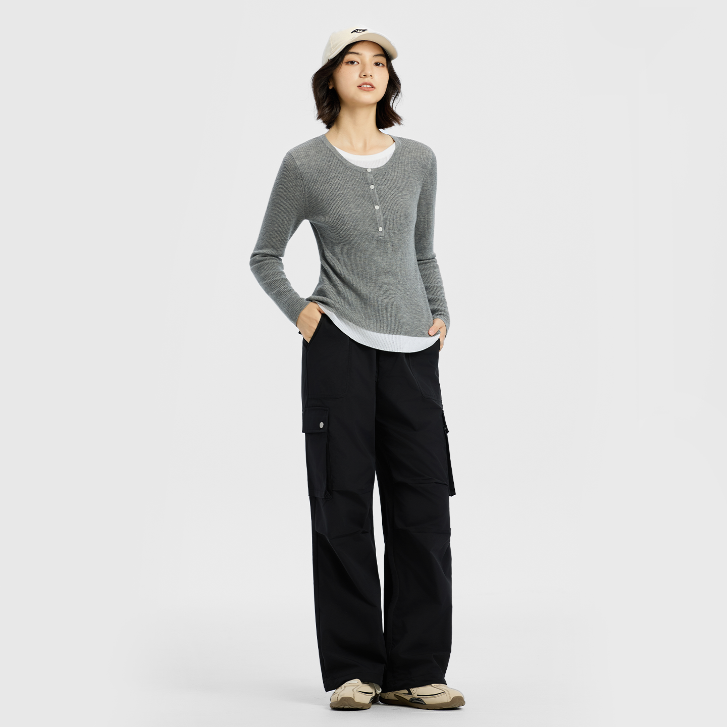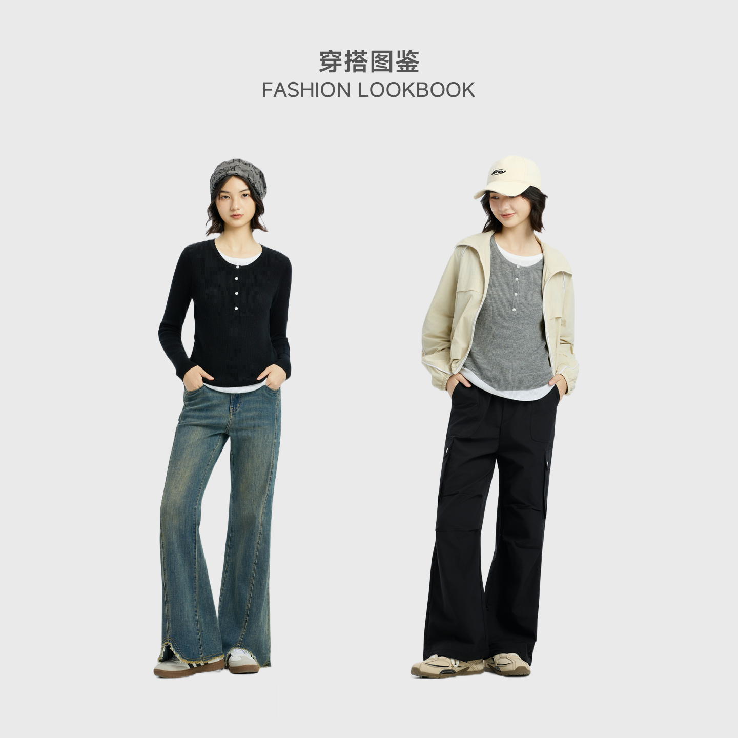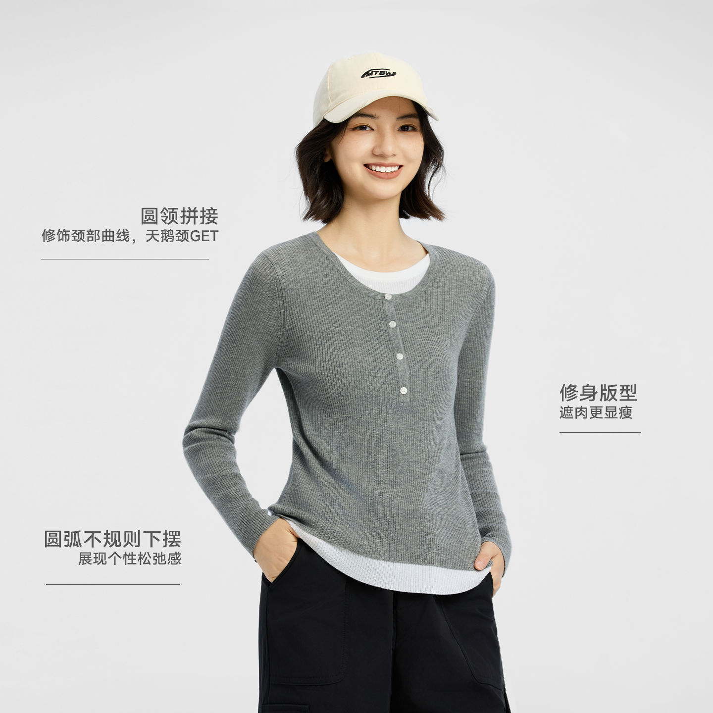 美特斯邦威毛衫女2025秋季新款假两件圆领纯色修身舒适百搭长袖