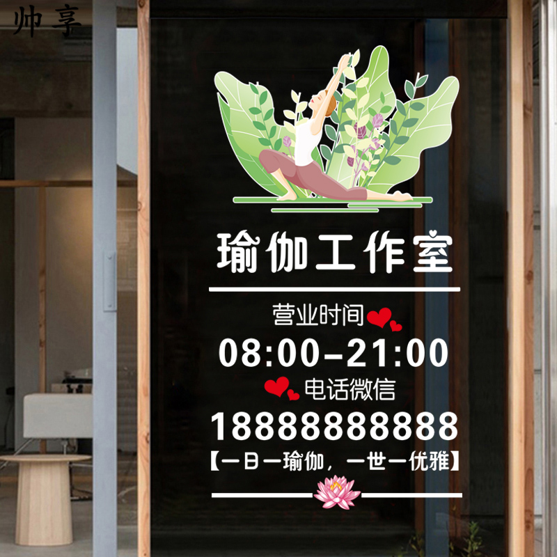 淘宝天猫瑜伽店项目玻璃门贴纸创意产后修复减肥馆营业时间橱窗装饰静电贴优惠券折扣价格–彩云间