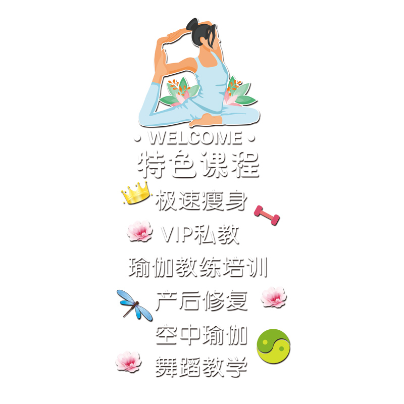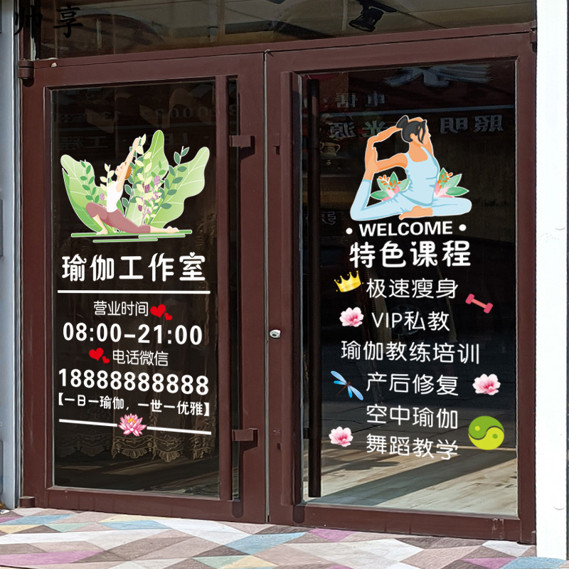 您的位置: 瑜伽店项目玻璃门贴纸创意产后修复减肥馆营业时间橱窗装饰静电贴