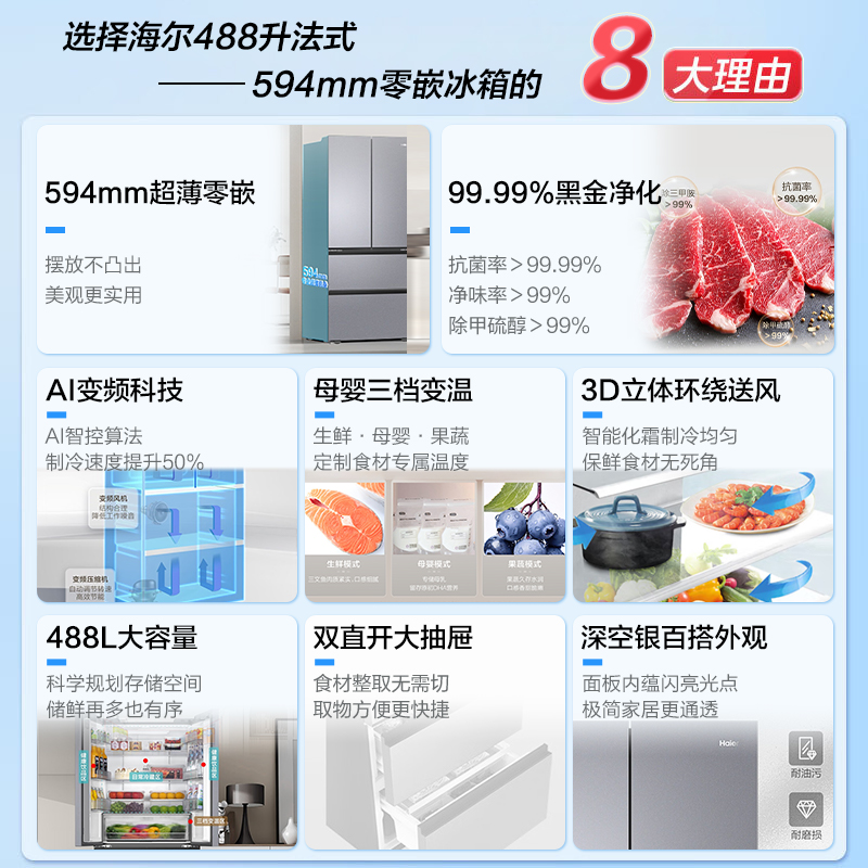 > 海尔488L法式多门冰箱家用大容量超薄594mm风冷无霜变频一级能效