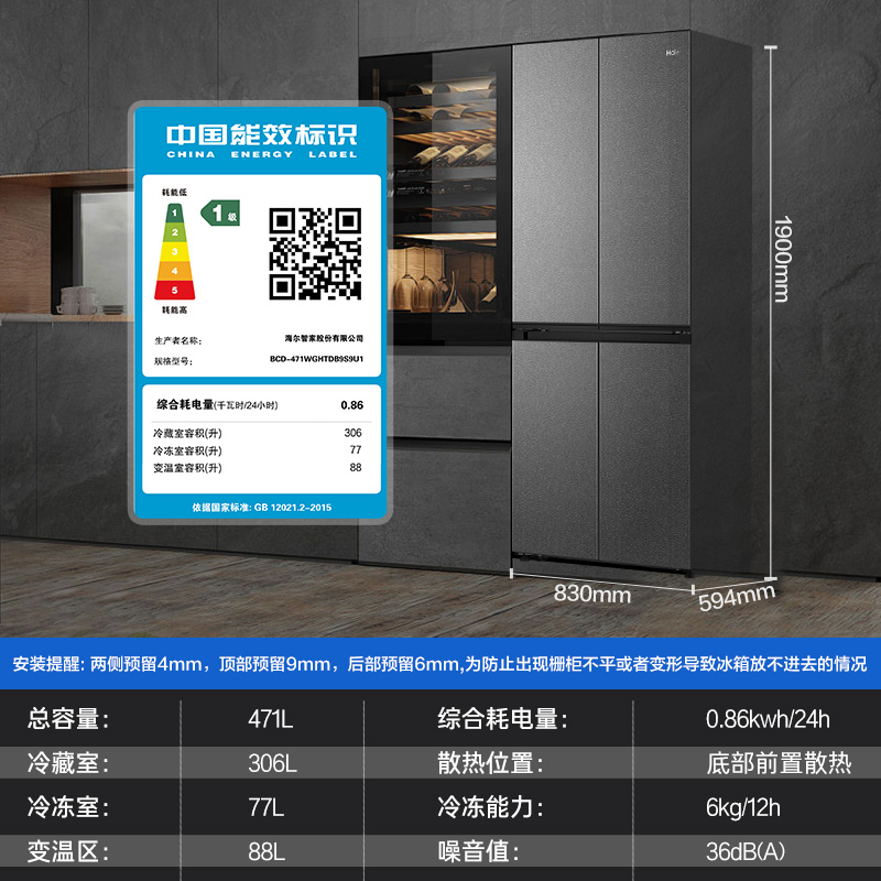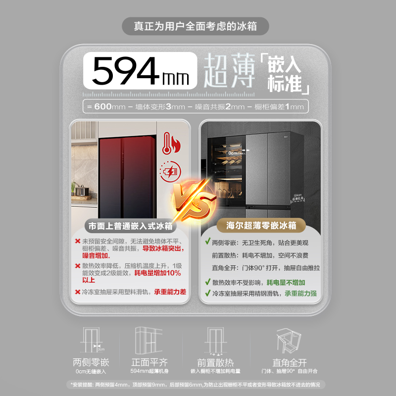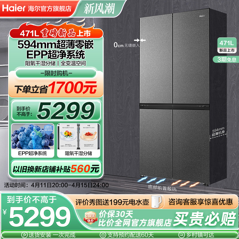 > 海尔471L十字双开四门零嵌入式594mm超薄家用风冷无霜电冰箱一级