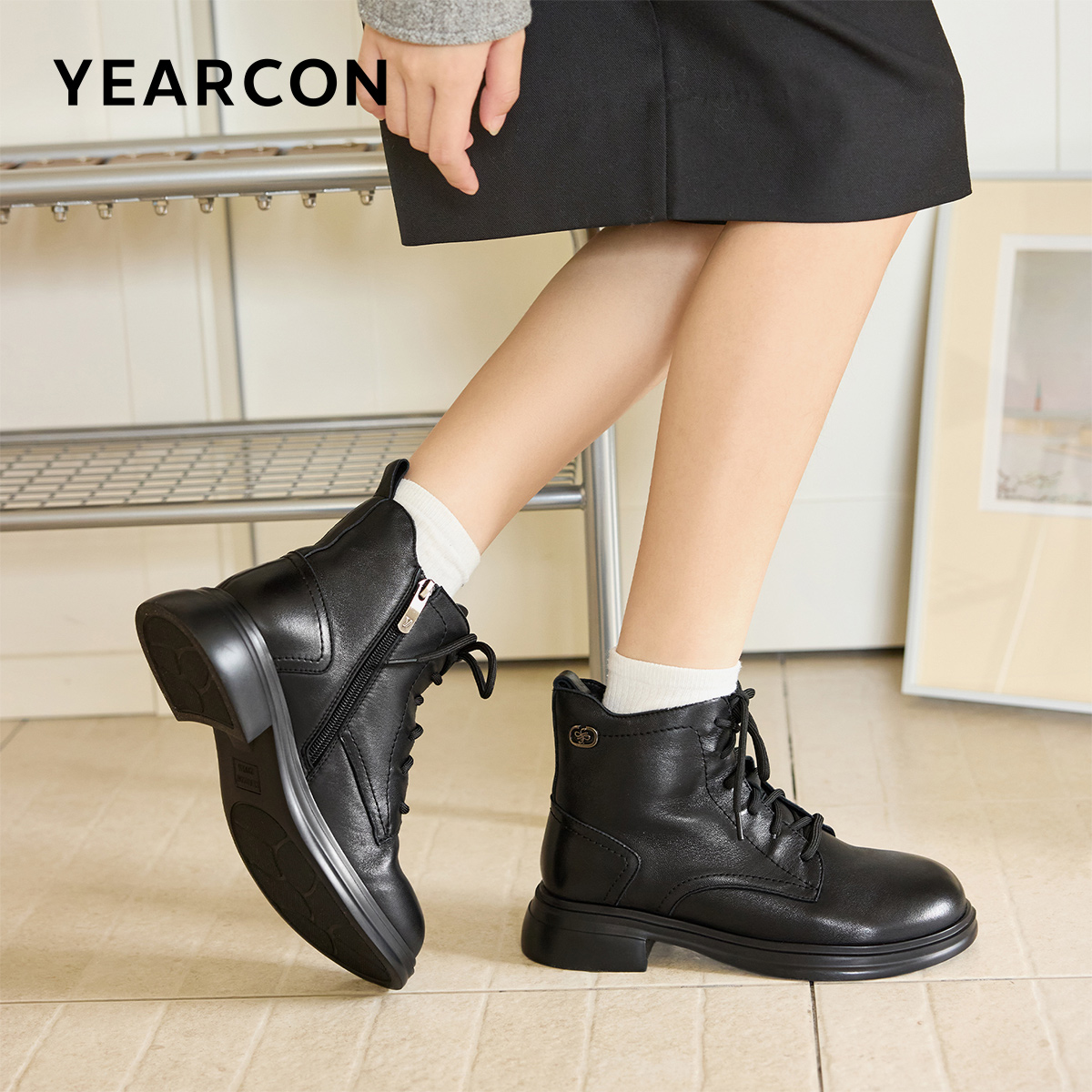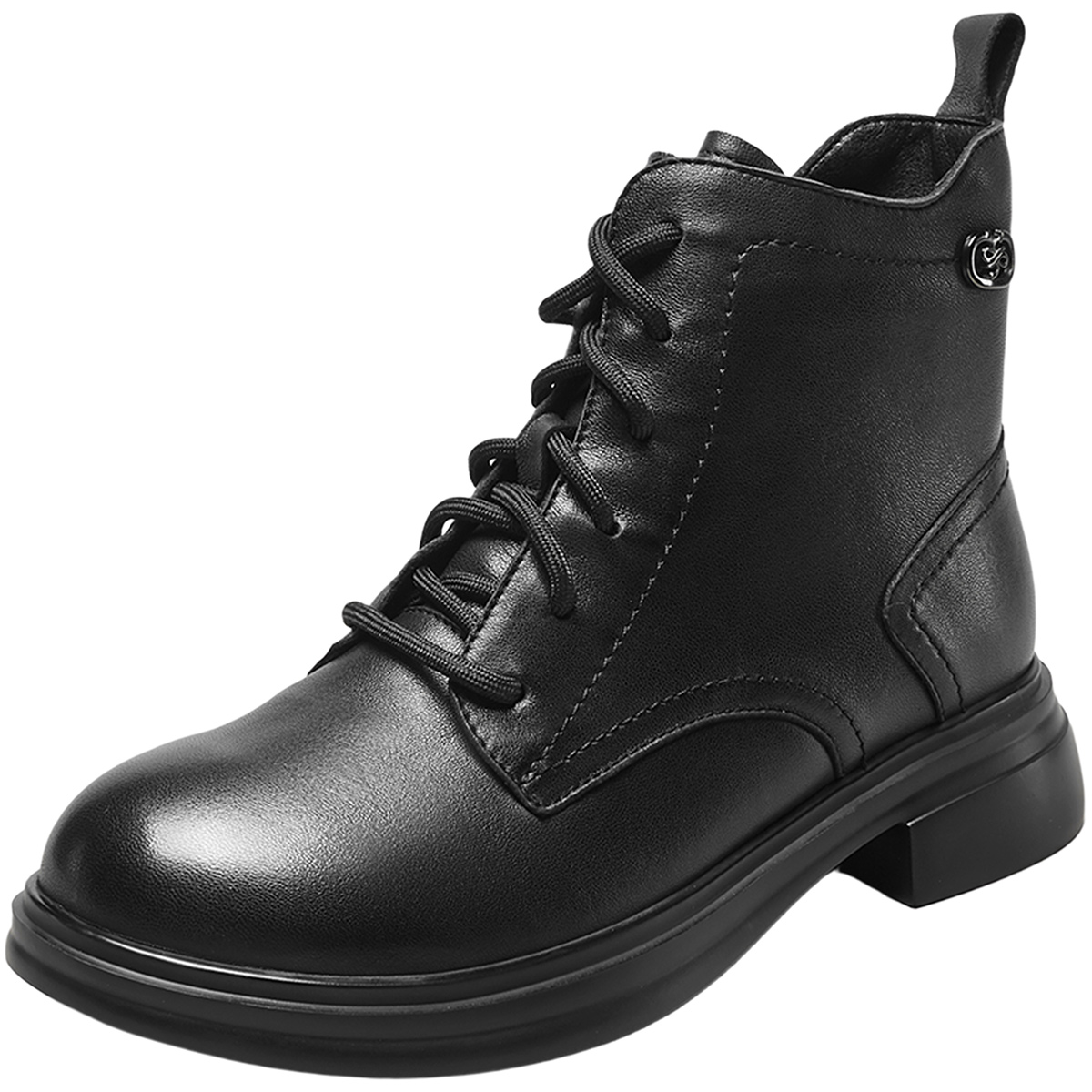 > 意尔康女鞋2025冬季皮鞋复古真皮休闲马丁靴粗跟英伦加绒保暖短靴