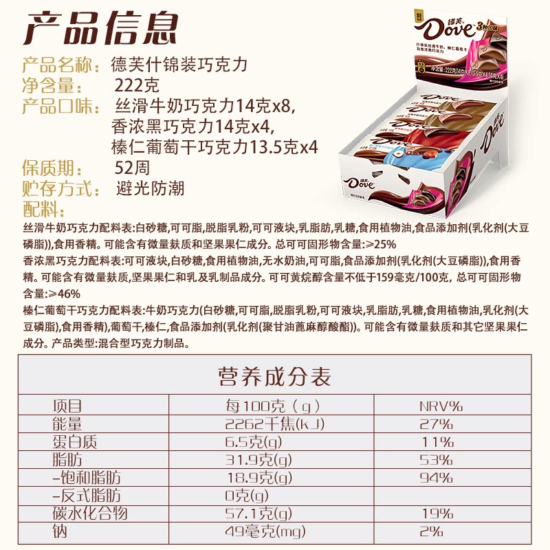 德芙什锦马年货巧克力牛奶黑巧榛仁葡萄干222g*1盒休闲零食喜糖果
