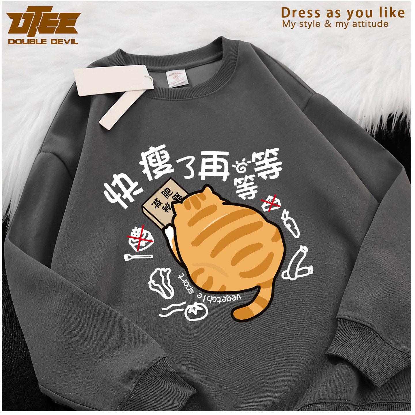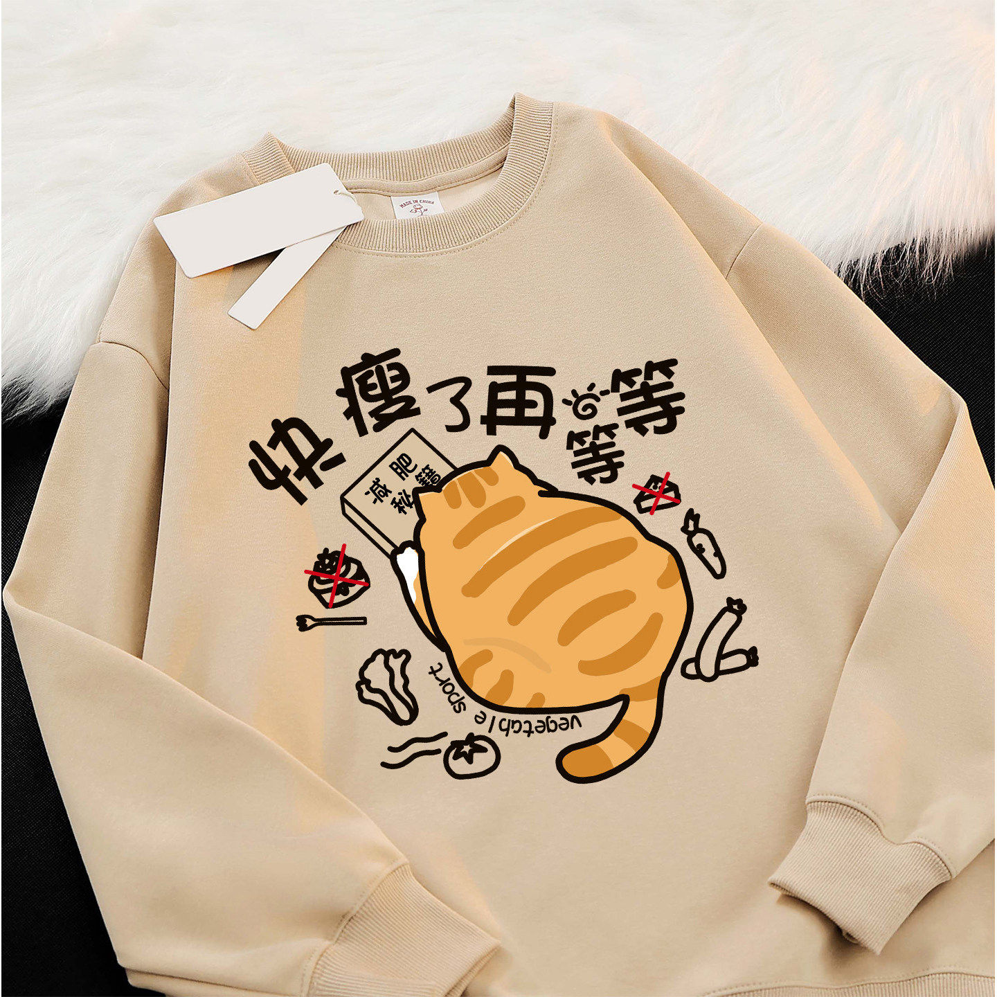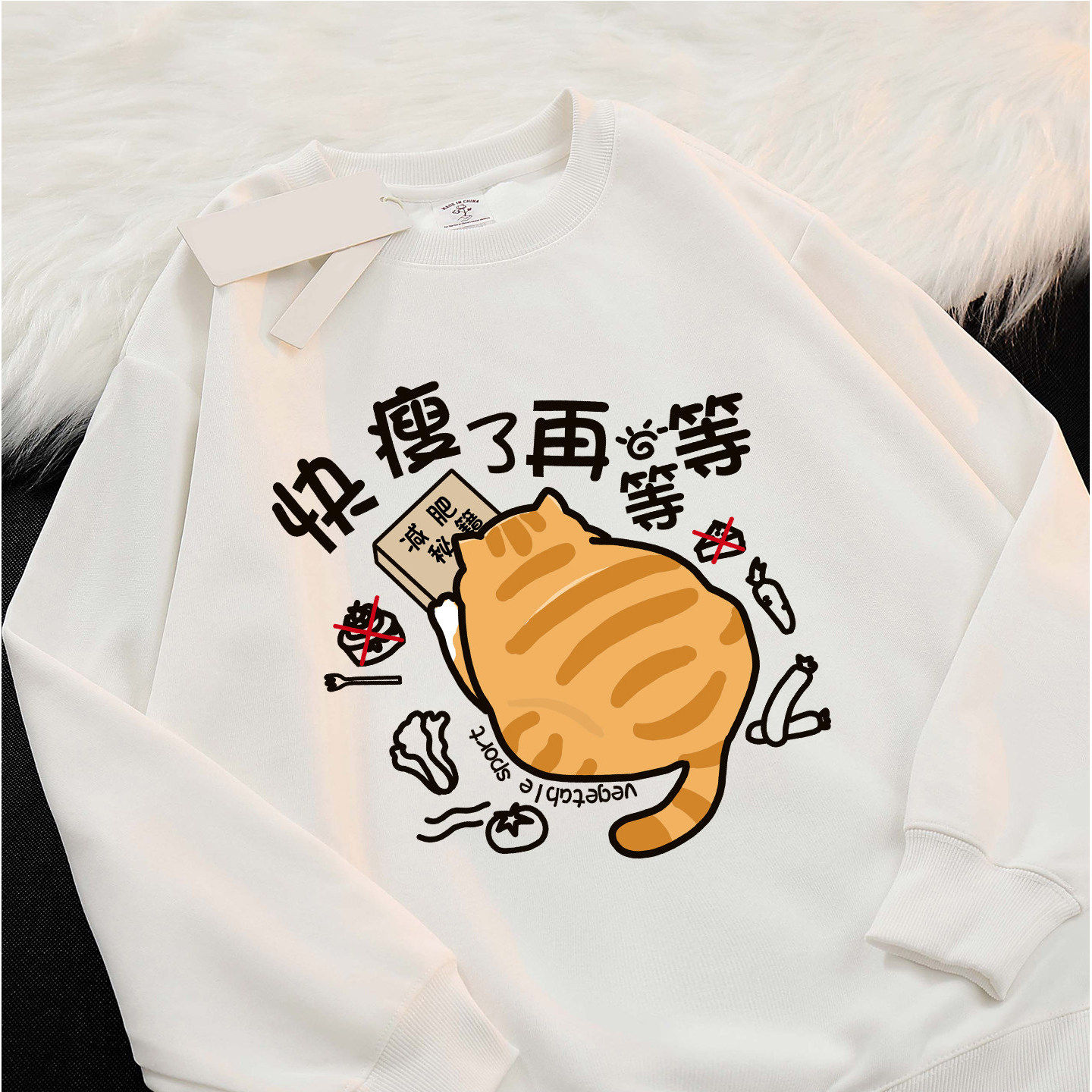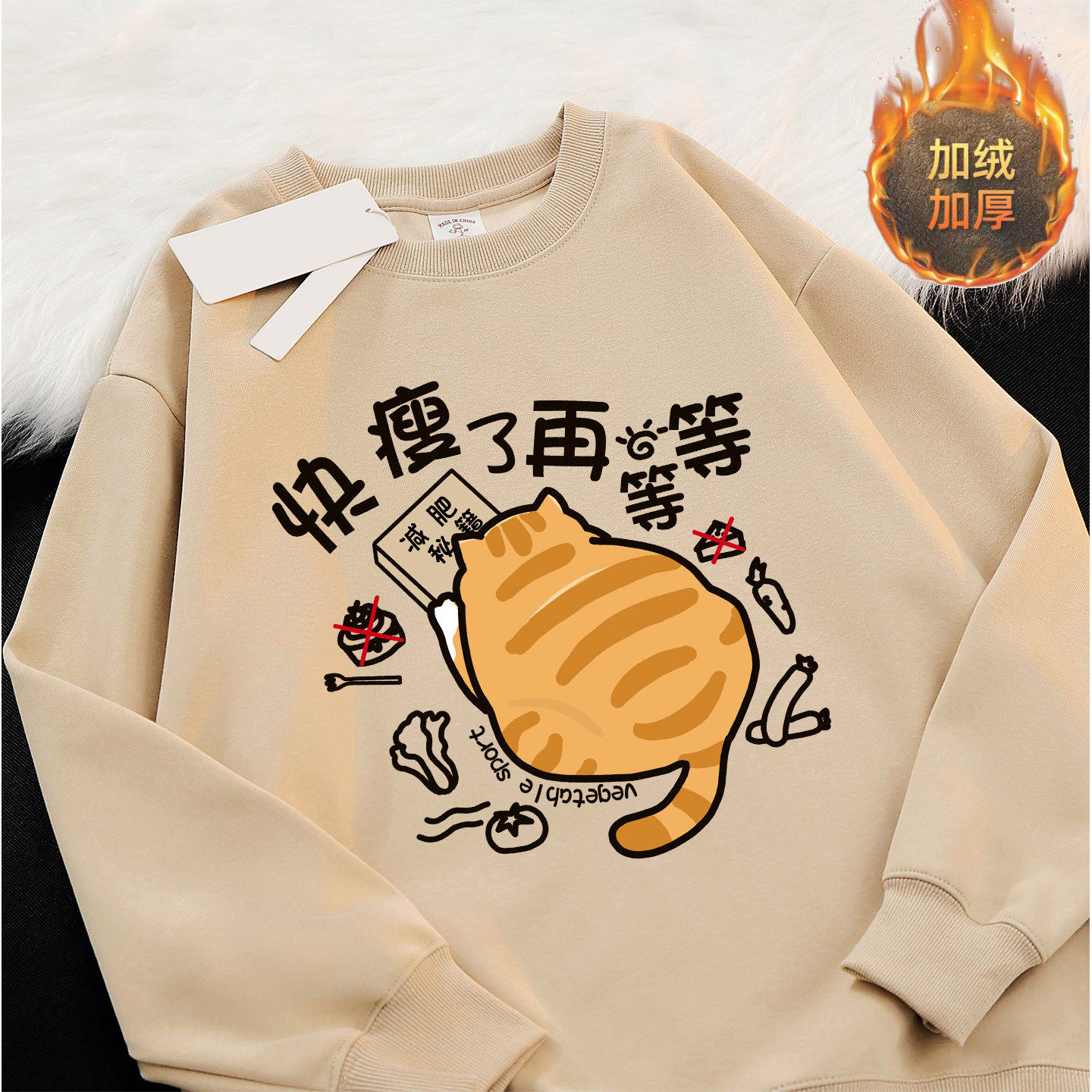 新品秋冬季小众图案橘猫减肥印花保持身材圆领薄绒卫衣宽松上衣女