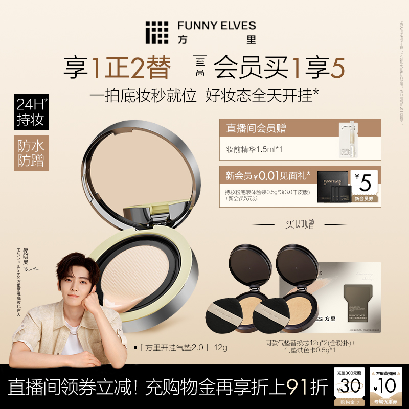 淘宝天猫【侯明昊同款】funnyelves方里开挂气垫2.0干油皮遮瑕控油不脱妆优惠券折扣价格–彩云间