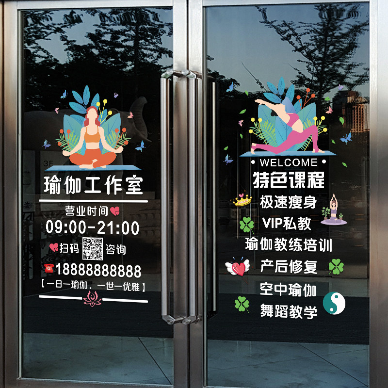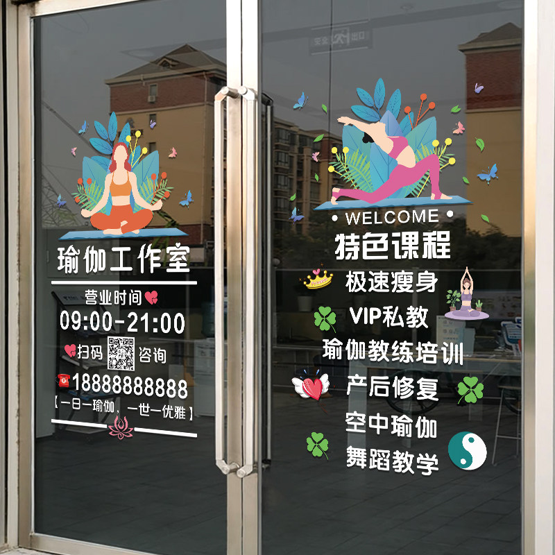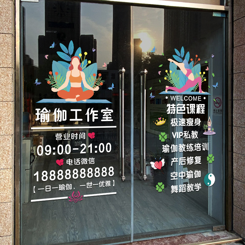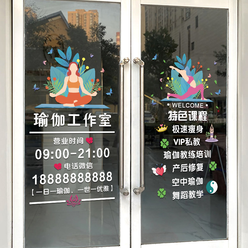 您的位置: 瑜伽馆玻璃门贴纸创意减肥健身房舞蹈养生馆店铺橱窗装饰广告贴纸