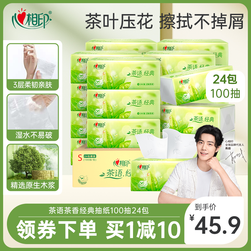 下拉+金刚卷!【心相印旗舰店】茶语私享系列,3层100抽24包量贩家庭装!韧性十足柔软亲肤,湿水不易破,三层压花表层不易分层,茶叶实力绽放,严格去菌把控,给家人一份安心