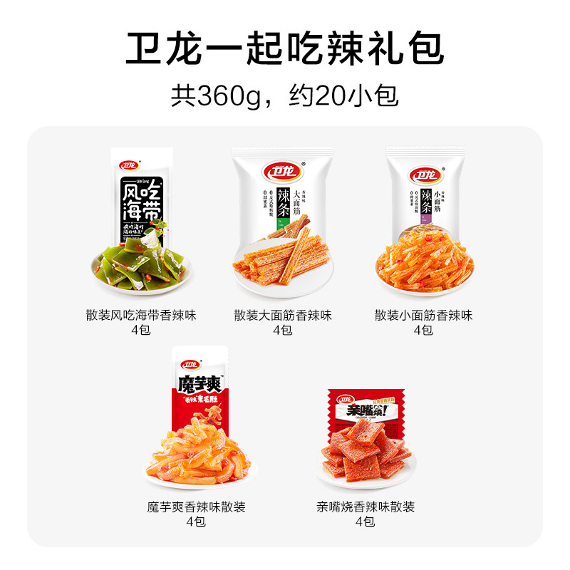 > 卫龙辣条缤纷礼包360g*1袋休闲零食即食海带亲嘴烧魔芋爽出游聚餐