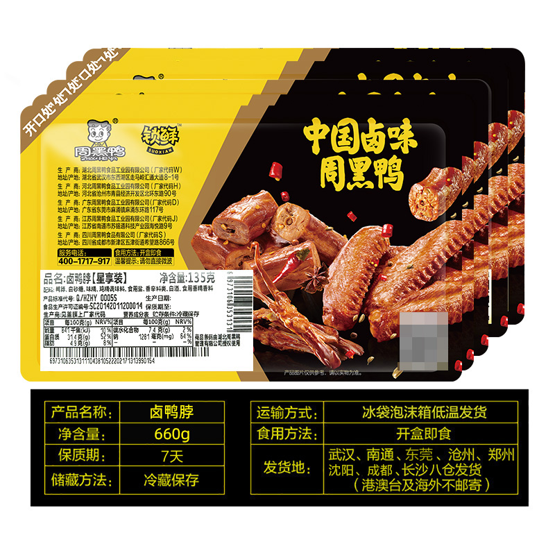 > 【周黑鸭旗舰店_锁鲜】甜辣鸭脖鸭锁骨鸭翅新鲜5盒套餐 卤味零食