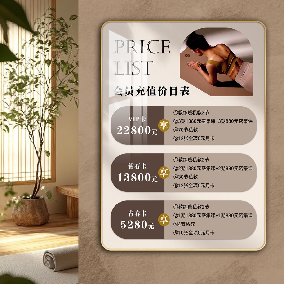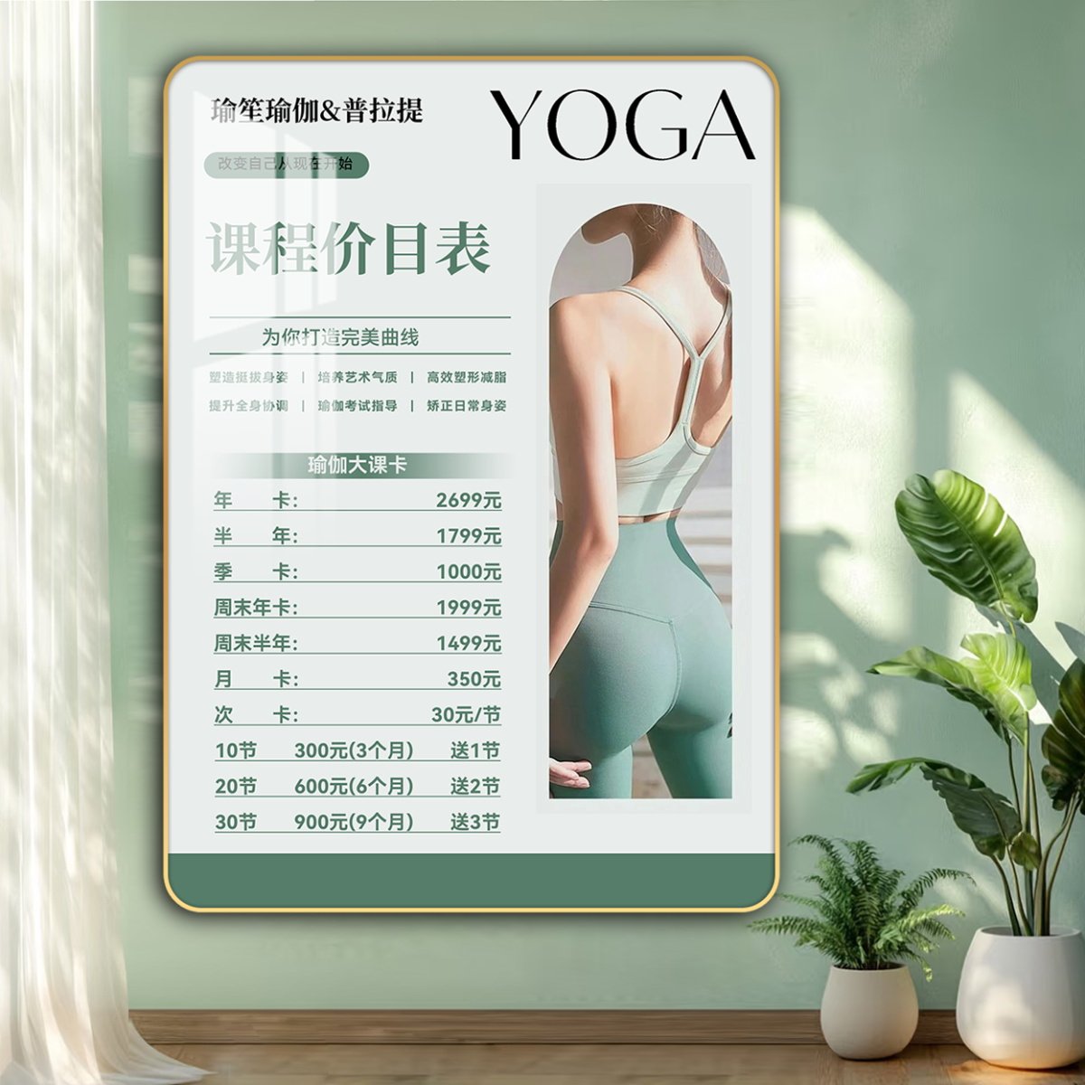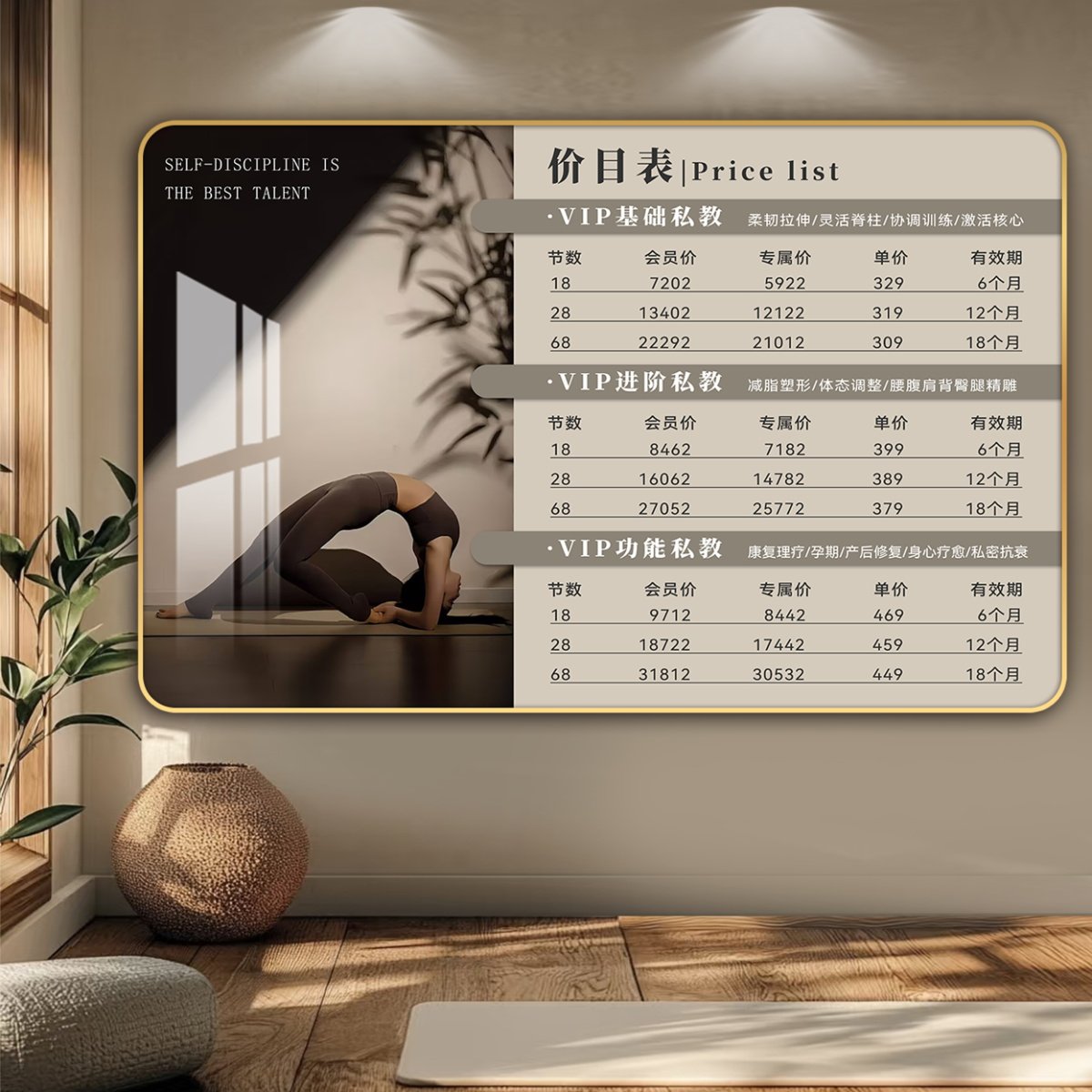 瑜伽馆价目表定制普拉提塑形私教课程价格表减肥瘦身形体课价格牌