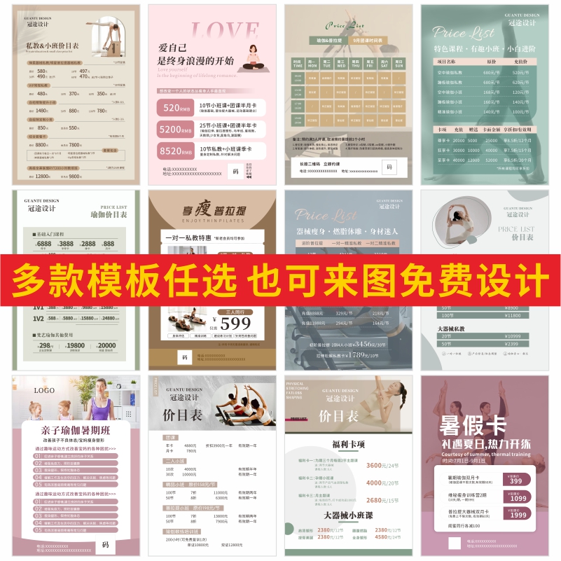 淘宝天猫瑜伽馆健身普拉提台卡价格表设计开业充值塑形减肥私教一对一课程价目表册定制摆台桌牌双面广告展示牌制作优惠券折扣价格–彩云间