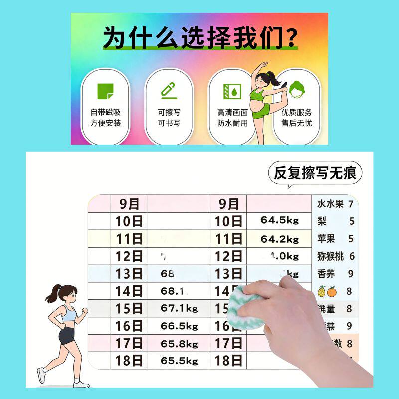 您的位置: 磁性体重记录表可擦写120天瘦身计划表减肥记录墙贴磁吸冰箱贴减肥打卡表磁吸贴墙个人目标记录表可磁吸6圆胶