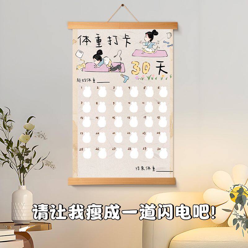 您的位置: 春天减肥打卡表100天挂画记录励志激励减重30天装饰实木挂轴客厅