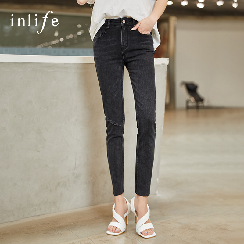 > 伊纳芙高腰直筒牛仔裤女修身显瘦裤子春秋新款百搭显瘦小脚铅笔裤