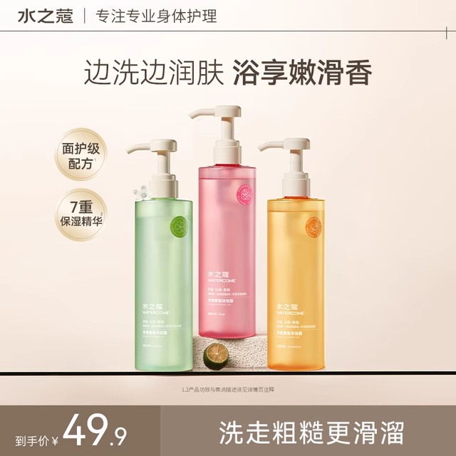 全是大瓶正装,没有小样凑数! 水之蔻旗舰店•沐浴露合集500ml 任选③件49.7亓,折16.5亓/件 伪体香神器,用完香香一整天~ 坚持用,肌肤滑滑嫩嫩的,很舒服