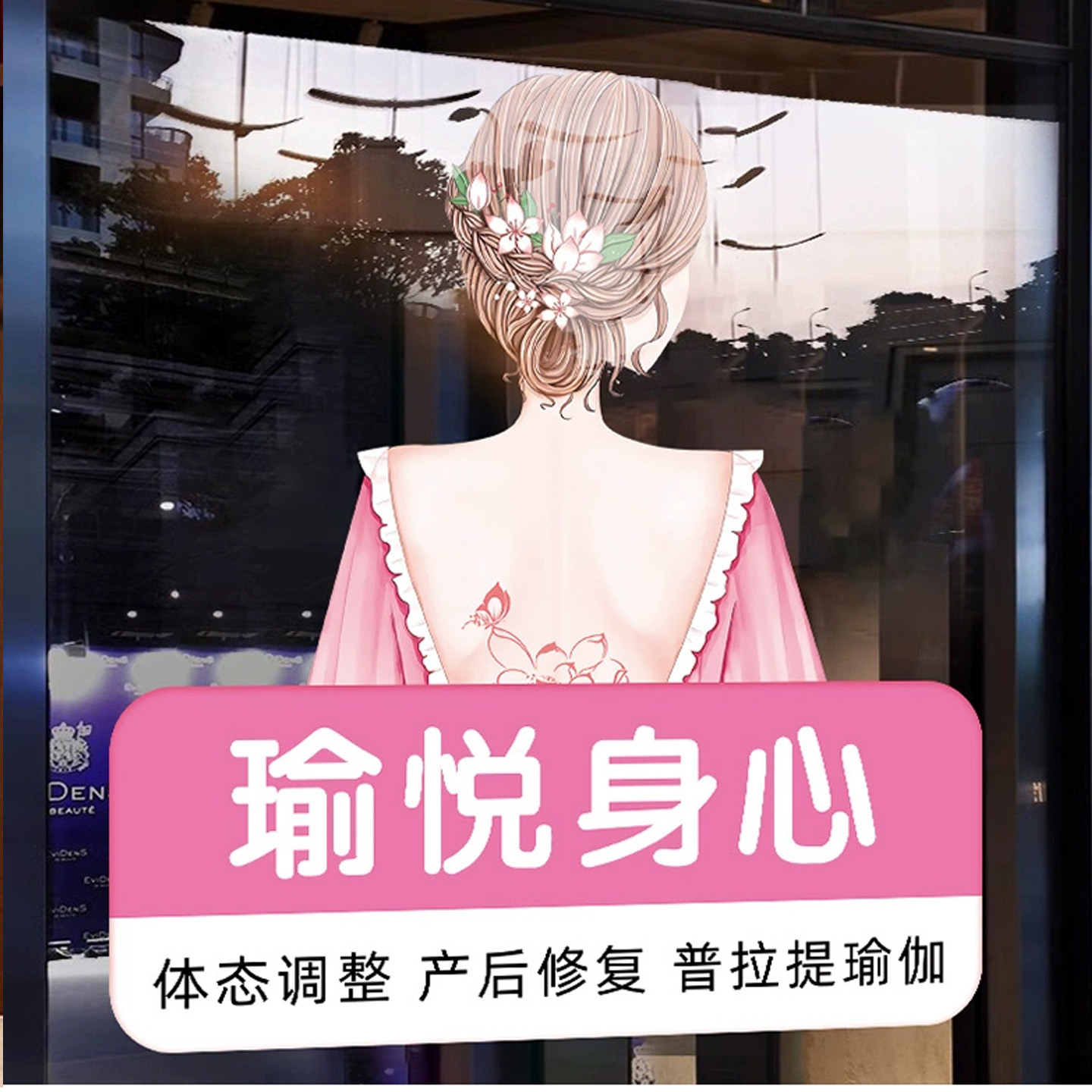 您的位置: 粉色普拉提瑜伽馆玻璃门贴纸美容院减肥健身房舞蹈养生馆装饰海报