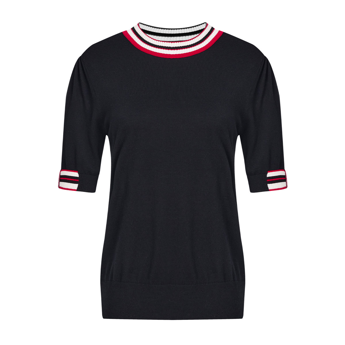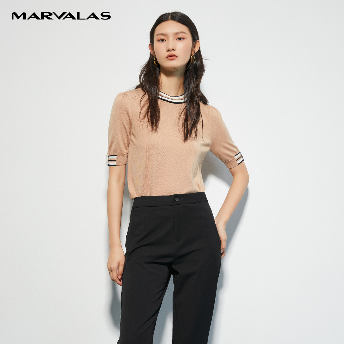 您的位置: 曼德诗高级感桑蚕丝针织衫撞色条纹圆领短袖套头衫女2024春夏复古