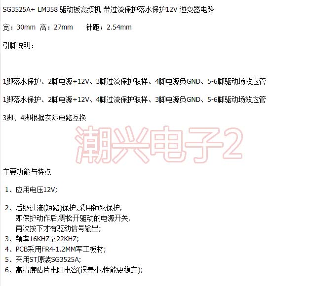 您的位置: SG3525A+ LM358 驱动板高频机 带过流保护落水保护12V 逆变器电路