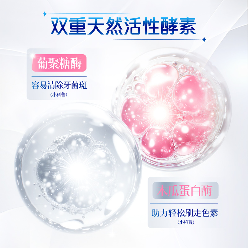 【zui新款,5重焕亮】里面添加了天然活性酵素像葡聚糖酶和木瓜蛋白酶 能轻松分解牙菌斑和色素~牙齿从内到外透出自然亮白!