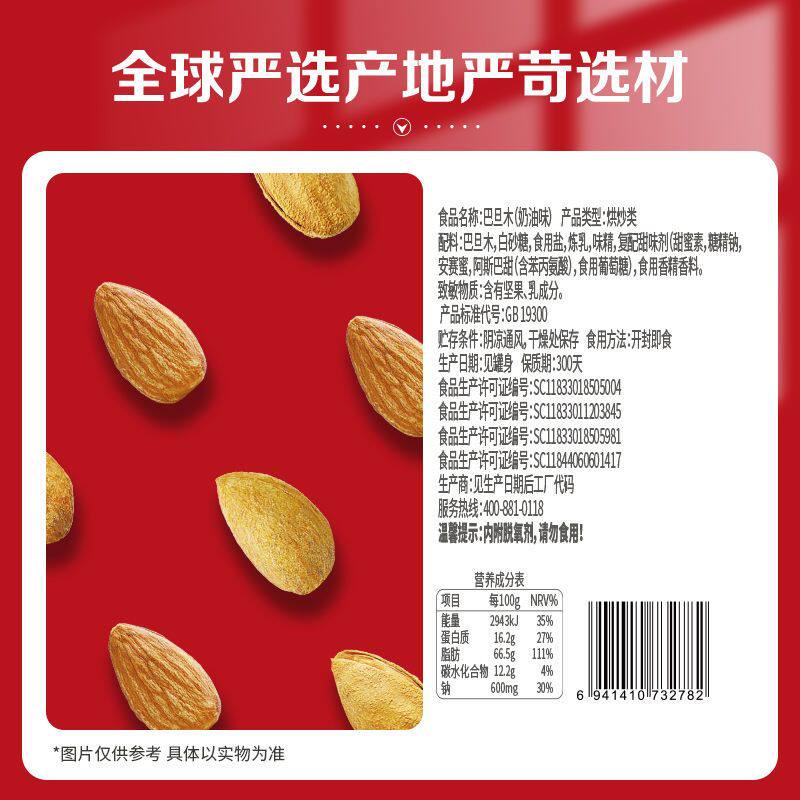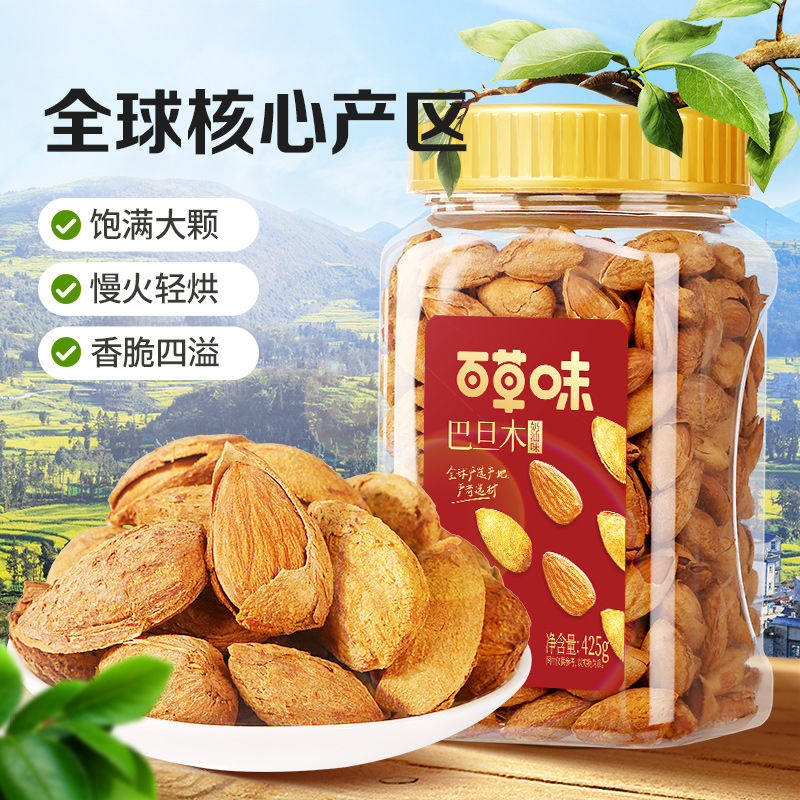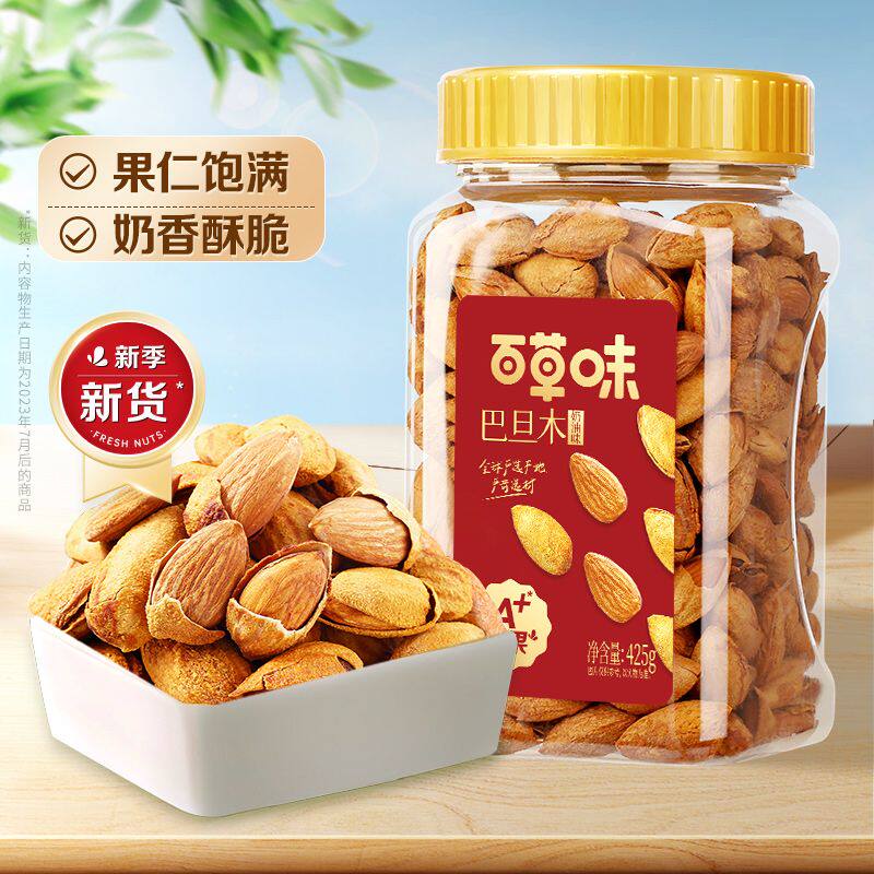 您的位置: 百草味巴旦木薄壳425g罐装原味奶油味巴达坦木坚果干果零食送礼