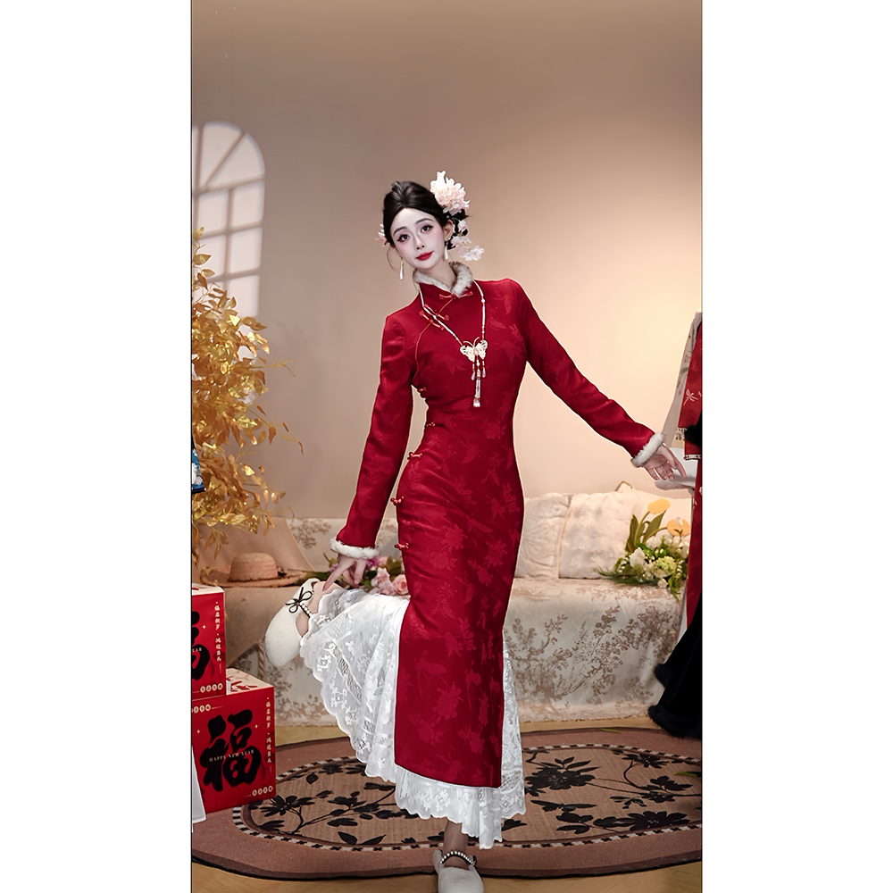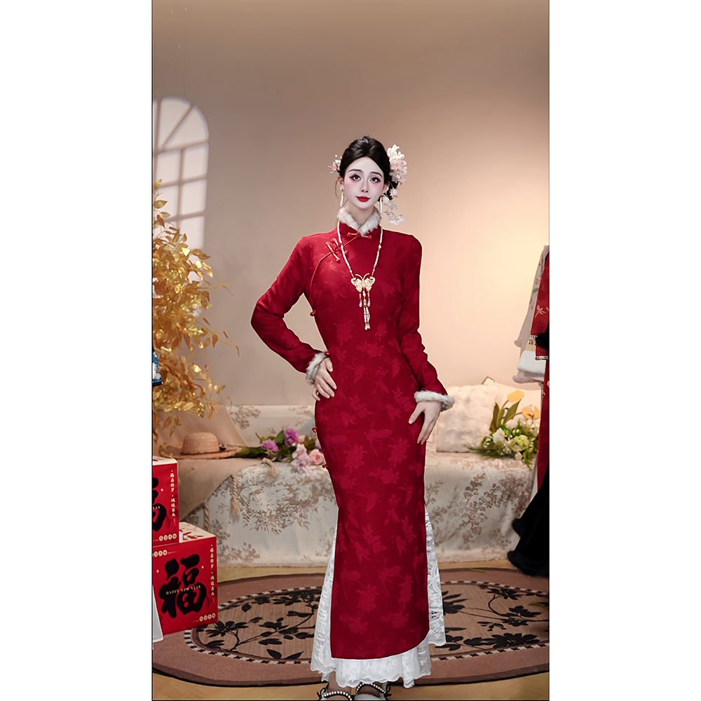 【朱砂痣-加绒】潇夫人自制红色旗袍敬酒服新中式连衣裙显瘦年轻�