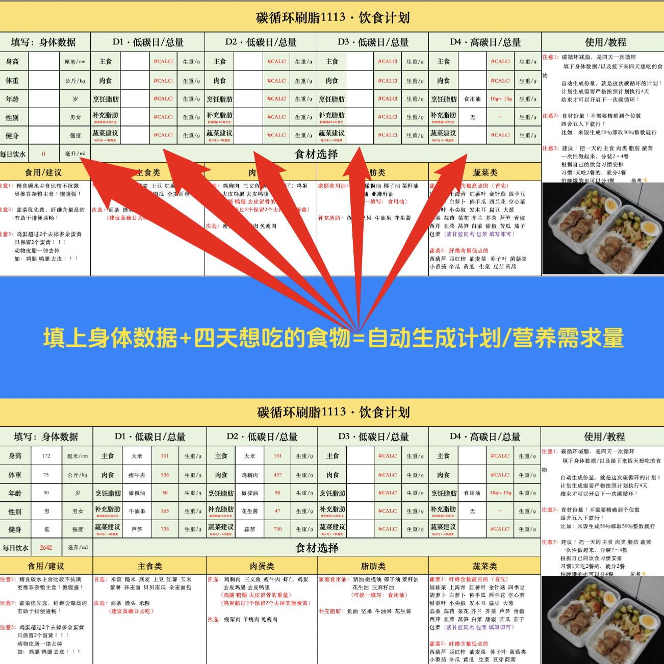 碳循环刷脂【填数据自动生成·饮食计划】降低体脂 减肥减脂计划
