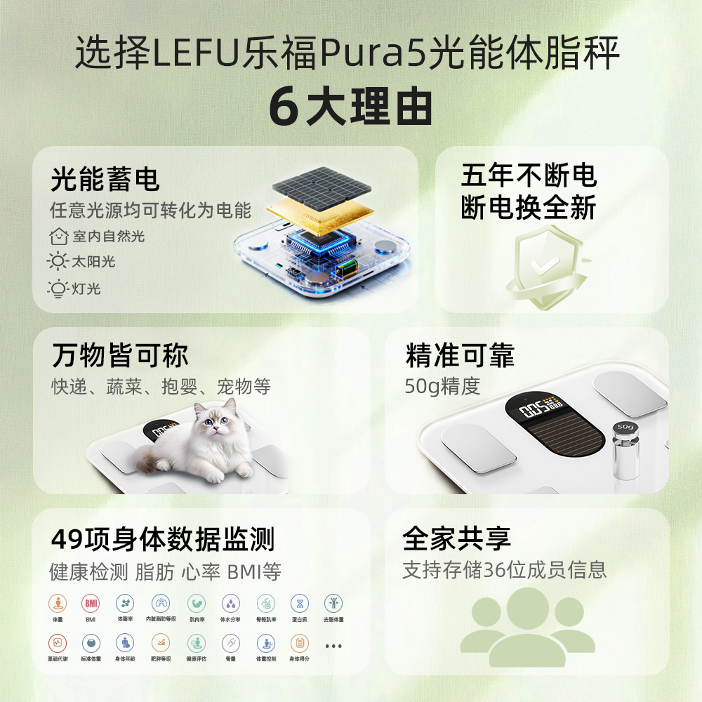 LEFU乐福Pura5【光能蓄电】体重秤体脂秤电子秤家用减肥人体称重专用智能小型精准磅斤数显示高精度2025新款