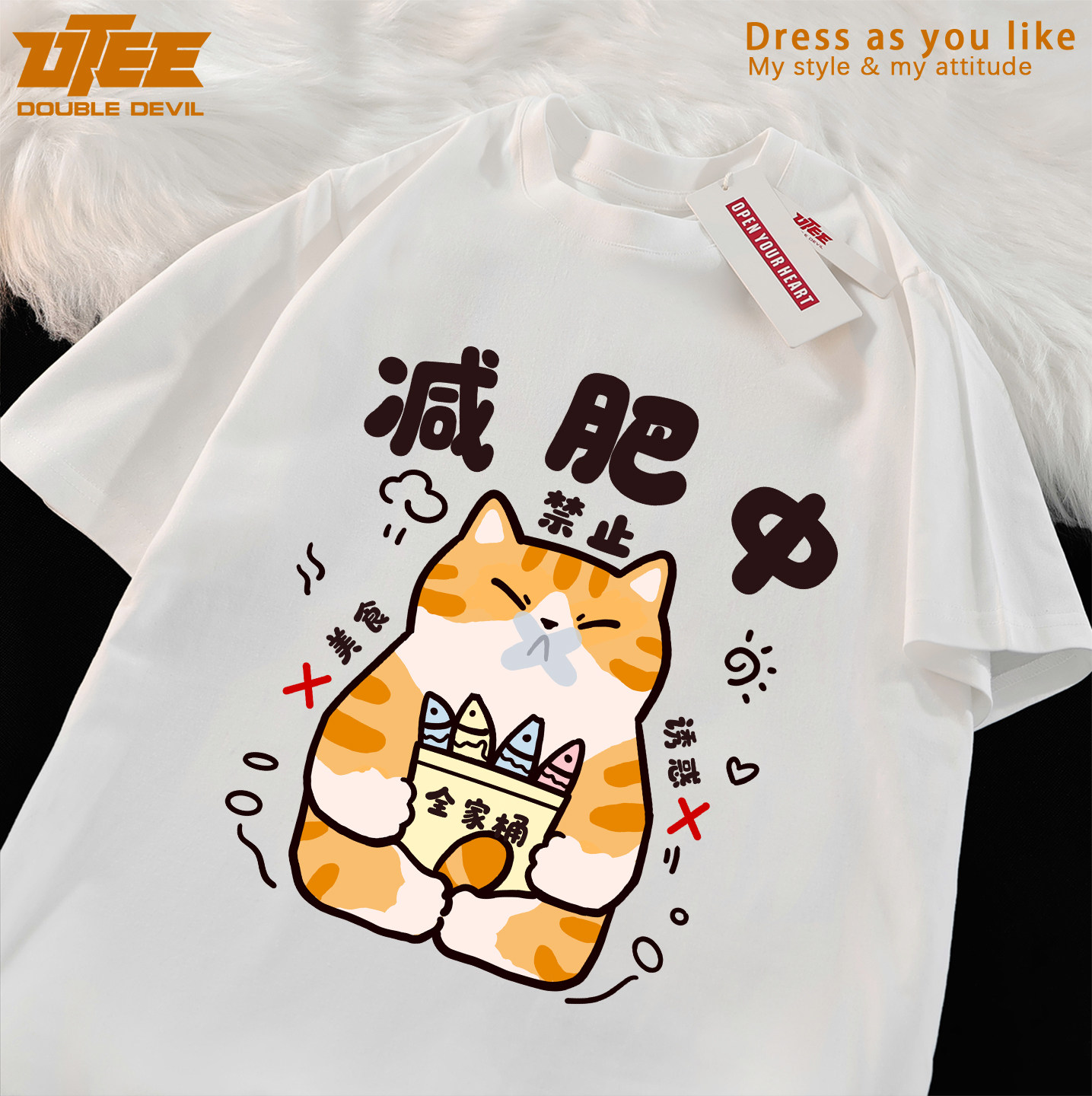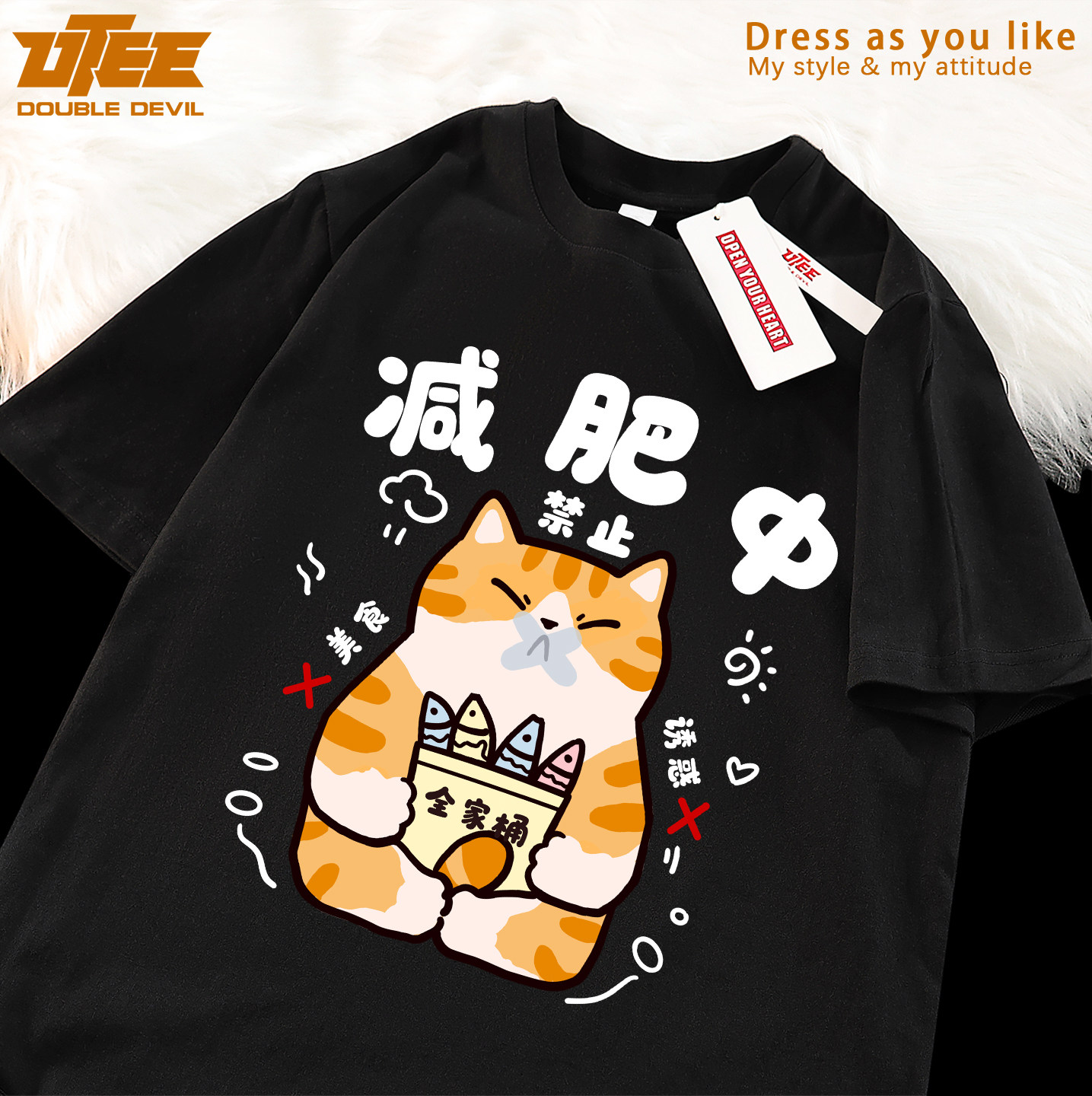 UTEE 减肥中 搞笑减肥橘猫原创短袖宽松男女纯棉休闲情侣T恤衫夏