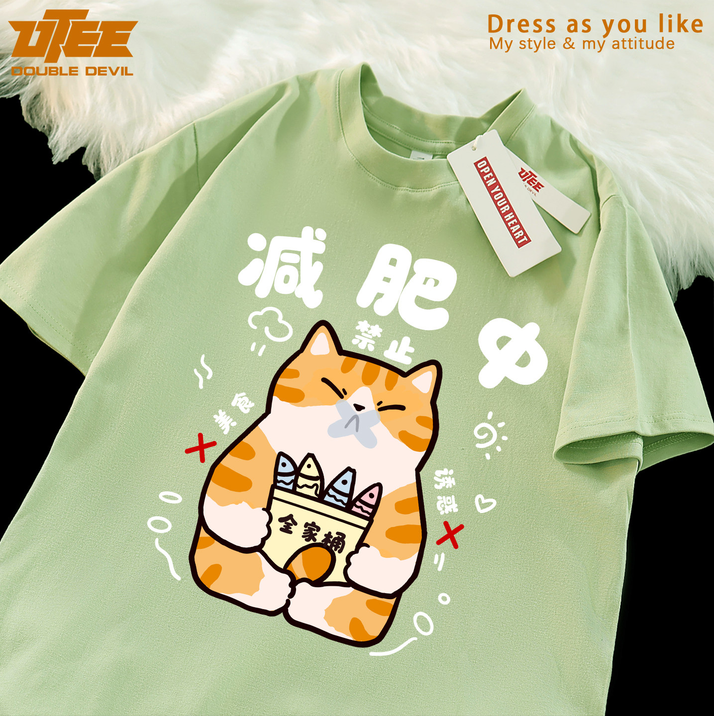淘宝天猫UTEE 减肥中 搞笑减肥橘猫原创短袖宽松男女纯棉休闲情侣T恤衫夏优惠券折扣价格–彩云间