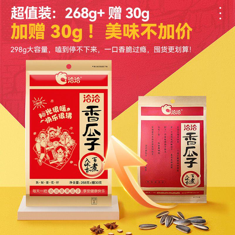 您的位置: 洽洽香瓜子268g*2袋五香葵瓜子红袋瓜子炒货经典红袋瓜子