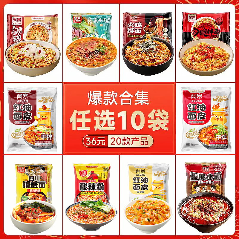 淘宝天猫【36元任选10袋】阿宽红油面皮甜水面重庆小面酸辣粉火鸡面泡面优惠券折扣价格–彩云间