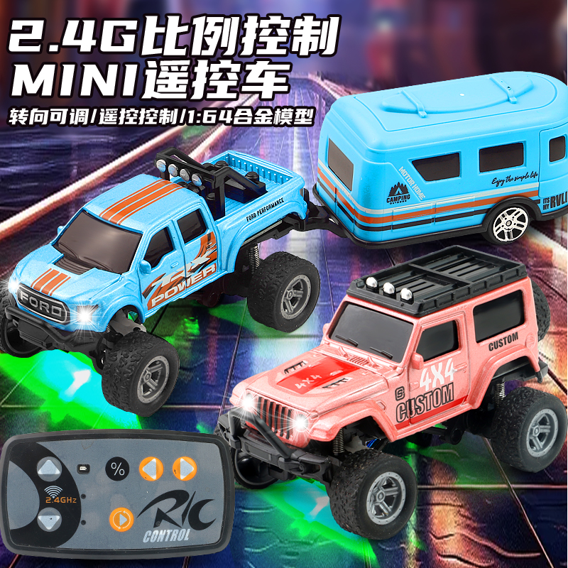 桌面迷你合金遥控车RC 2.4G充电越野车1:64大脚车炫酷灯光减震车