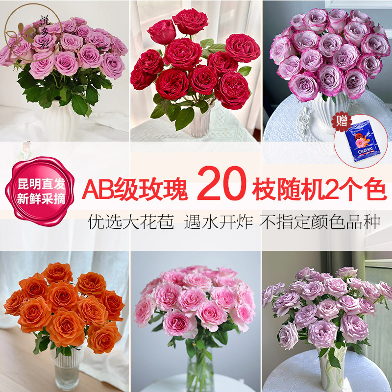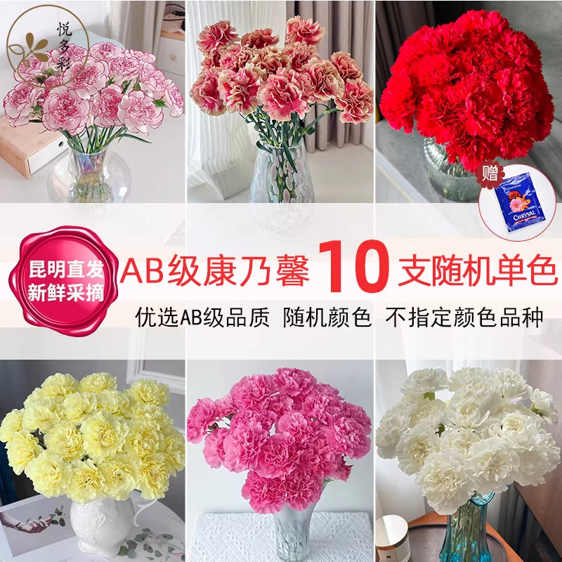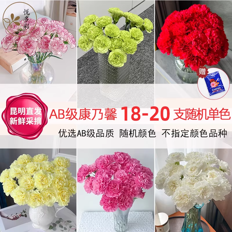 > AB级玫瑰鲜切花康乃馨礼物送速递云南基地直发水养悦多彩鲜花切花