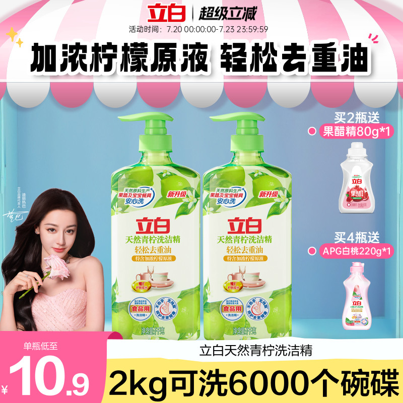 拍1kg*2瓶选项送莓果洗洁精80g*2袋,超级立减1.7元+88vip省0.6元+淘金币抵扣0.27元后21.45元,单瓶只需10.7元,买4瓶送apg白桃220g*1瓶,立白天然青柠洗洁精,加浓柠