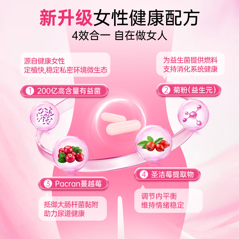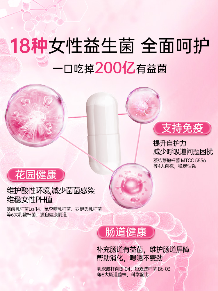 一口吃掉200亿活性菌,维护肠道屏障,帮助消化嗯嗯不费劲,18种女性菌株平衡菌群私密好状态,提升自护力减少呼吸道问题困扰