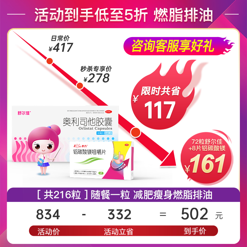 您的位置: 舒尔佳奥利司他胶囊减肥药燃脂排油抗肥胖减脂一粒排油瘦身60mg