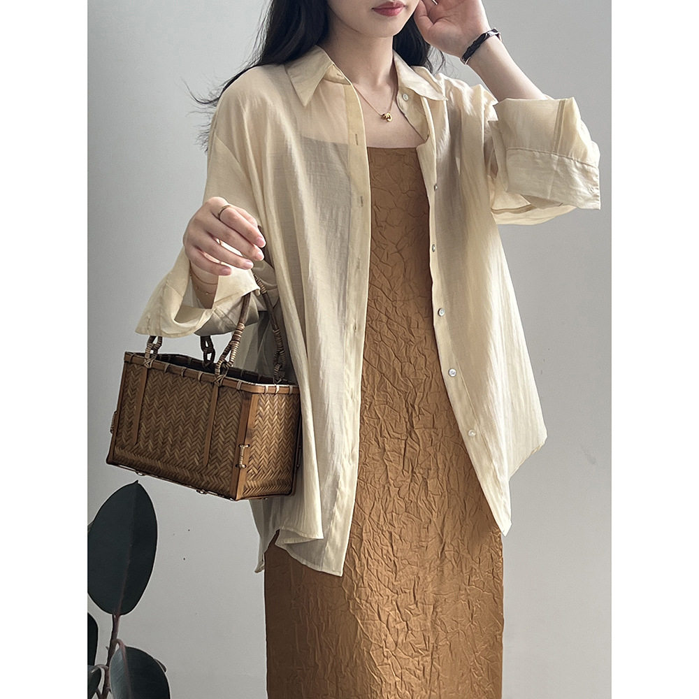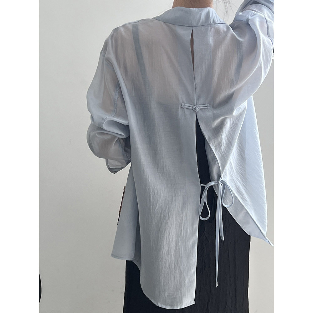 您的位置: 后背盘扣天丝衬衫女夏薄纱防晒珠光透视露背开叉上衣吊带外搭开衫