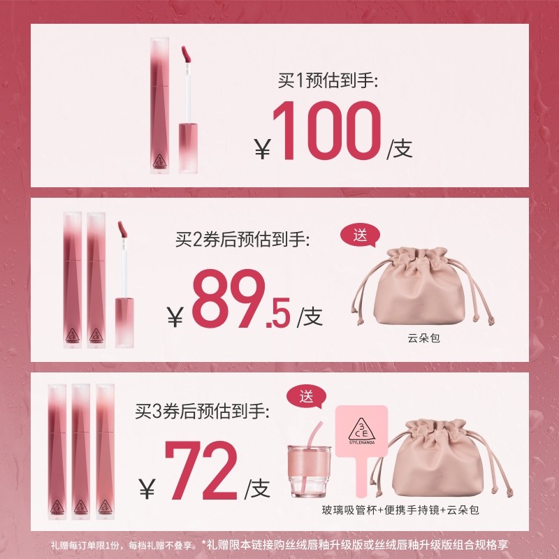 淘宝天猫【送礼】3CE丝绒唇釉升级版 哑光口红橘色裸色红棕女生日礼物优惠券折扣价格–彩云间