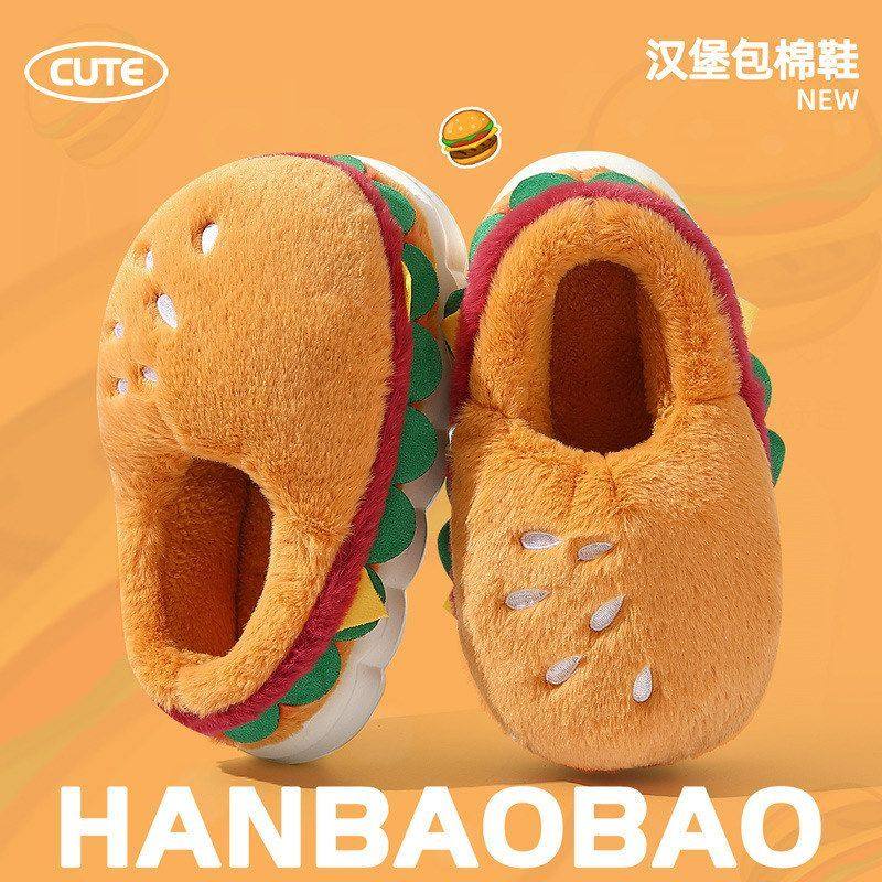 汉堡棉鞋女秋冬季情侣家居家用卡通防滑毛绒保暖包跟棉拖鞋男批发