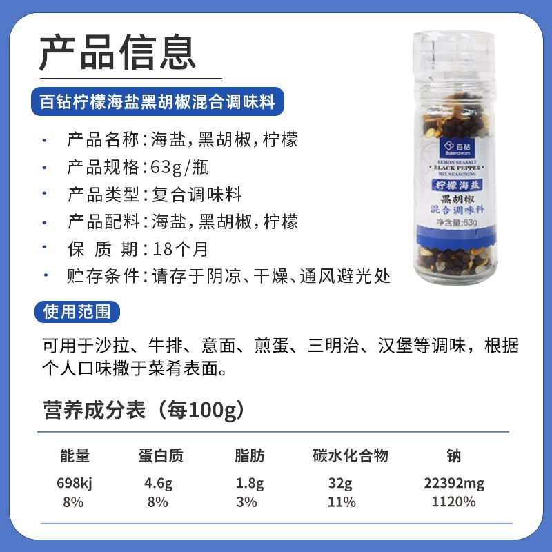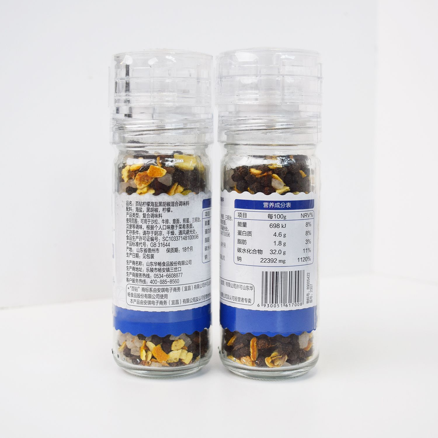 您的位置: 百钻柠檬海盐黑胡椒混合调味料63g 腌制西餐牛排专用海盐带研磨盖