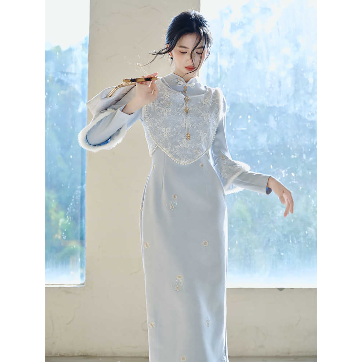 【淮枝雪-加绒】潇夫人自制少女新中式国风蓝色旗袍马甲套装连衣�