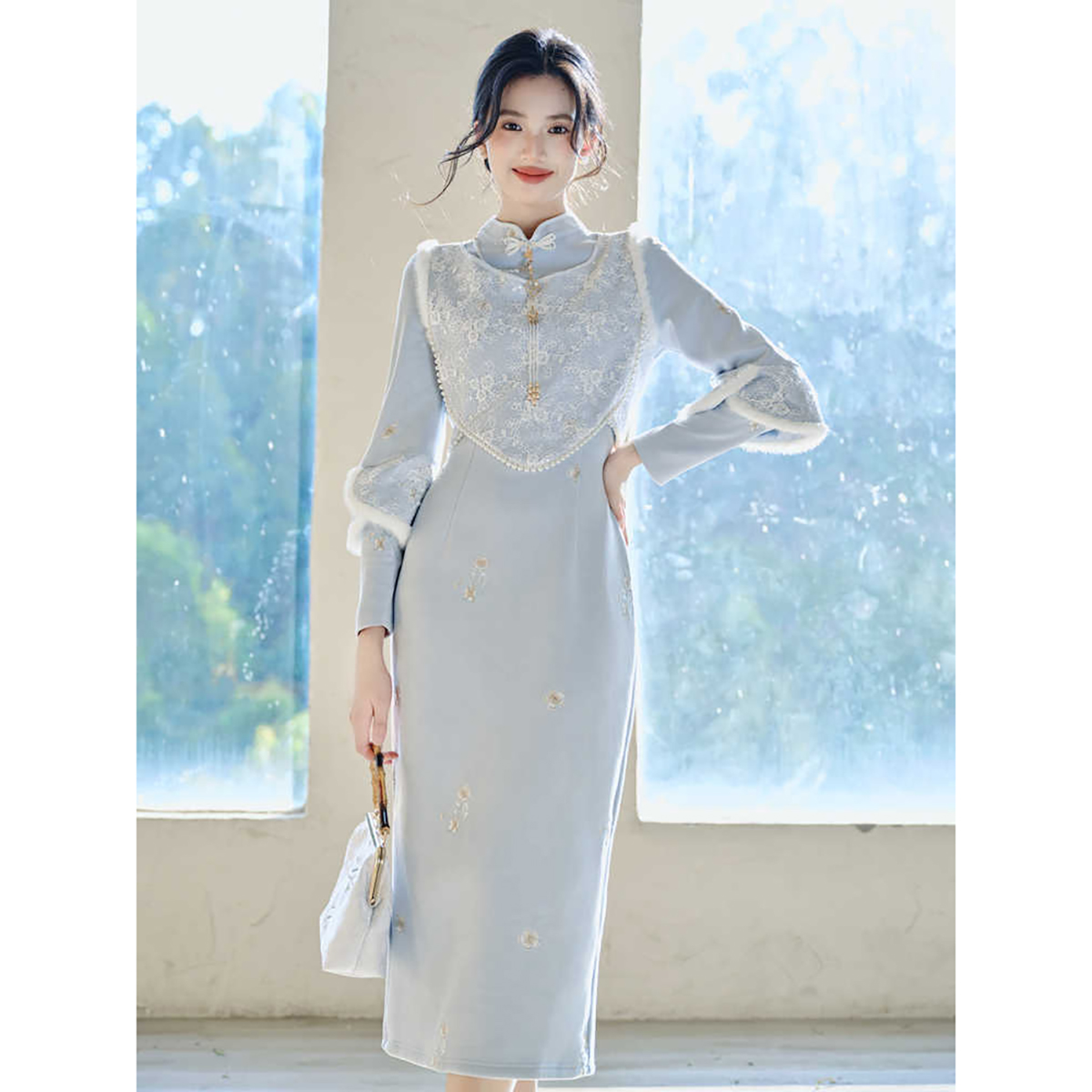 您的位置: 【淮枝雪-加绒】潇夫人自制少女新中式国风蓝色旗袍马甲套装连衣�