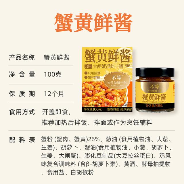 您的位置: 【不等】蟹黄鲜酱 常温即食拌面拌饭大闸蟹蟹肉蟹黄蟹膏蟹粉酱
