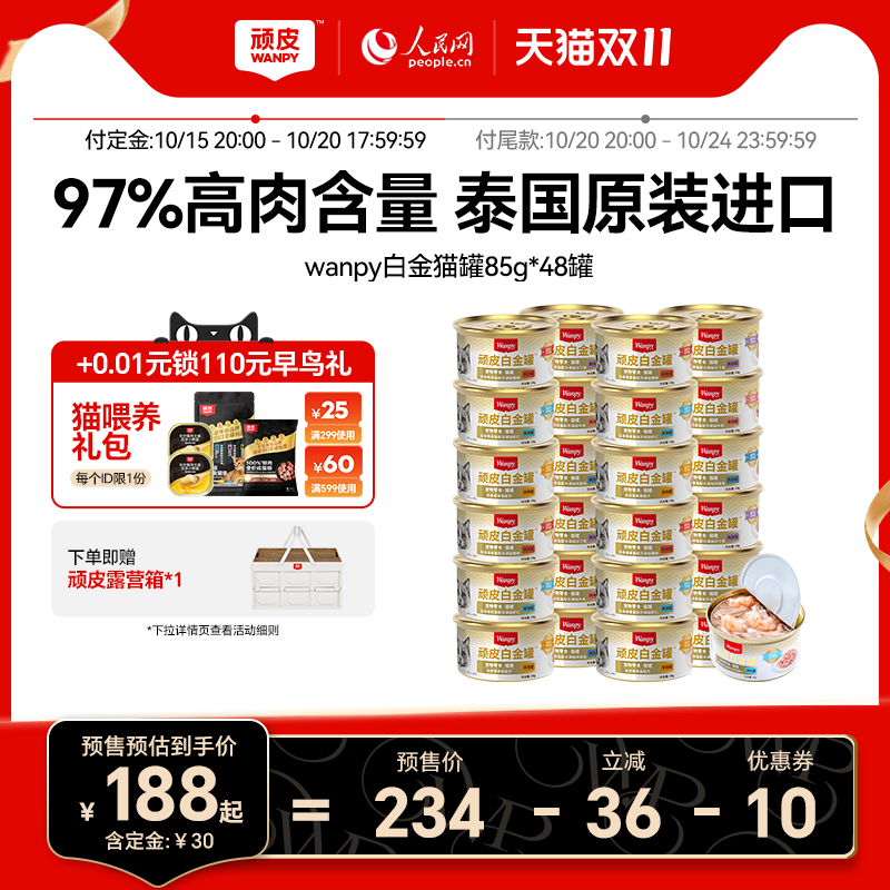 淘宝天猫【双11预售 先加购!】进口顽皮泰国白金猫罐头非主食48罐猫咪零食优惠券折扣价格–彩云间