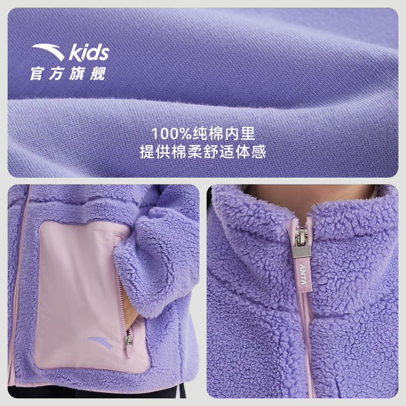 安踏儿童女童外套秋冬款加绒新款保暖防寒羊羔绒女孩毛毛加厚上衣。