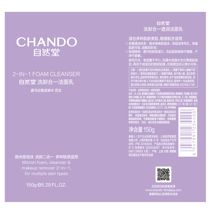 自然堂洗卸合一透润洁面乳深度清洁洗面奶。