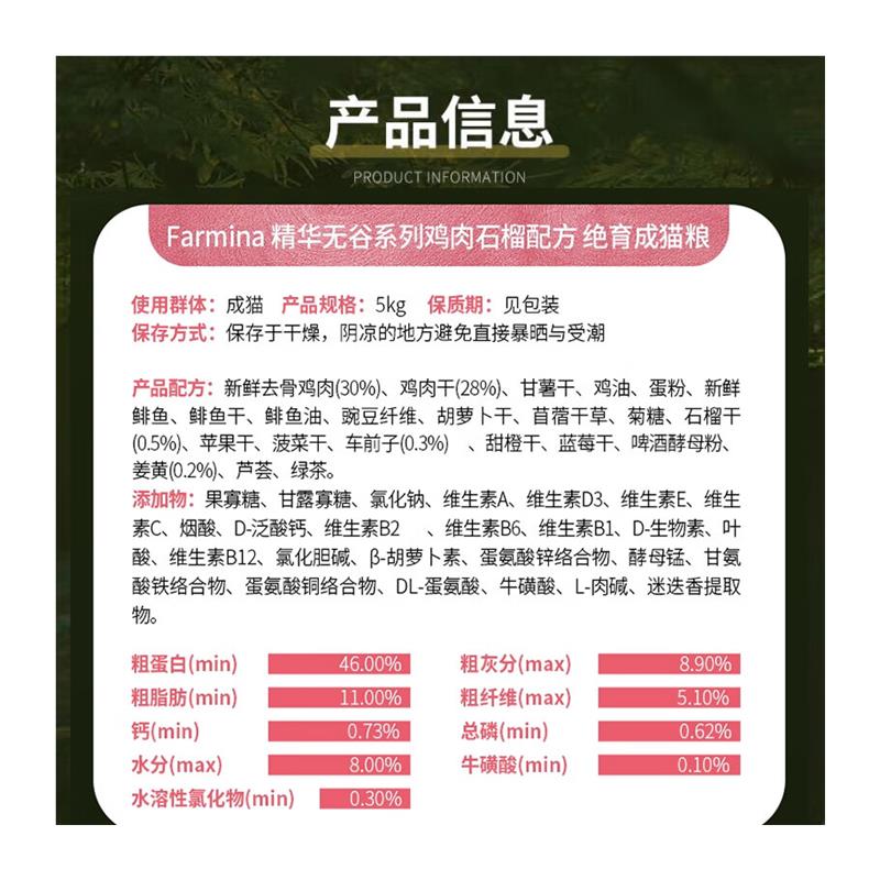 淘宝天猫法米娜(Farmina)减肥猫粮石榴鸡肉绝育成猫粮5kg 控制体重进口猫优惠券折扣价格–彩云间